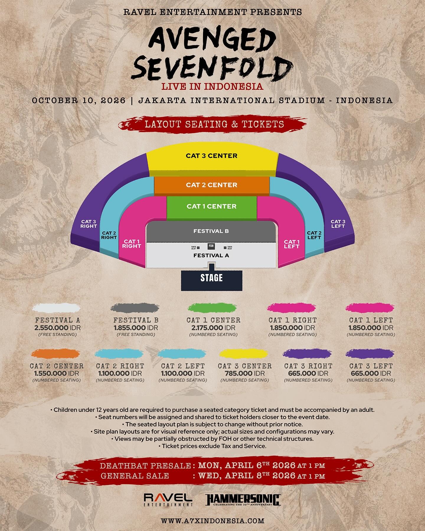 Pantau terus akun resmi @ravelentertainment dan www.a7xindonesia.com untuk update terbaru mengenai special guests, line-up pembuka, serta informasi tambahan lainnya.