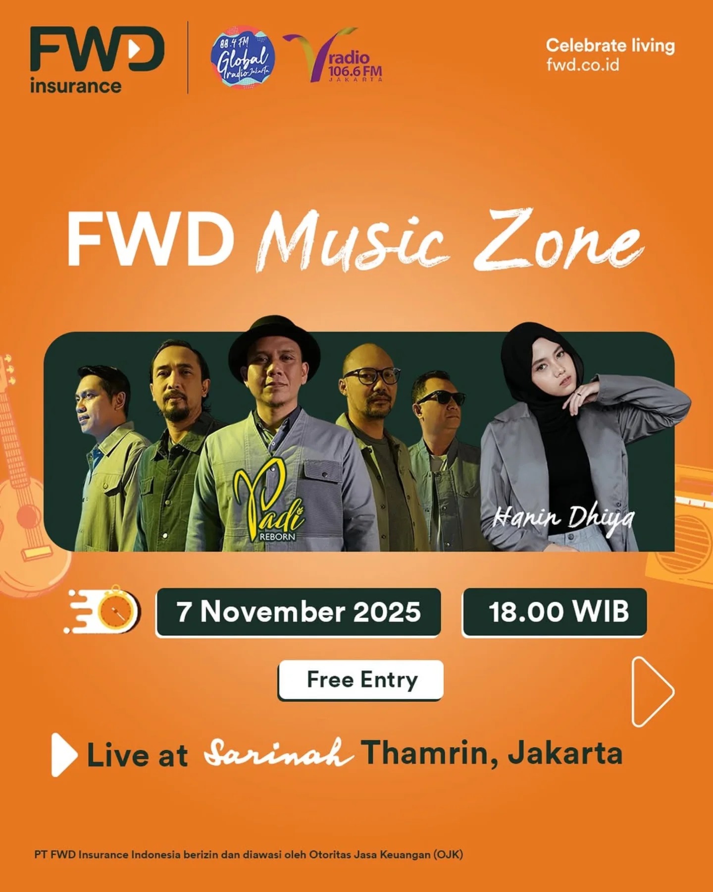Dari kawasan pusat kota, FWD Music Zone akan tampil di Anjungan Sarinah pada Jumat, 7 November 2025 mulai pukul 18.00 WIB. Acara ini menghadirkan Padi dan Hanin Dhiya, mengusung konsep pertunjukan musik santai di tengah ruang publik ibu kota.
