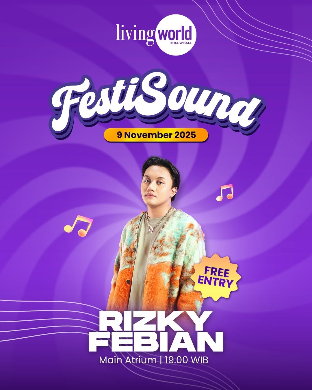 Festi Sound di Living World Kota Wisata pada 9 November 2025 pukul 19.00 WIB, menampilkan Rizky Febian yang akan menutup akhir pekan dengan suasana meriah di area atrium utama mal.