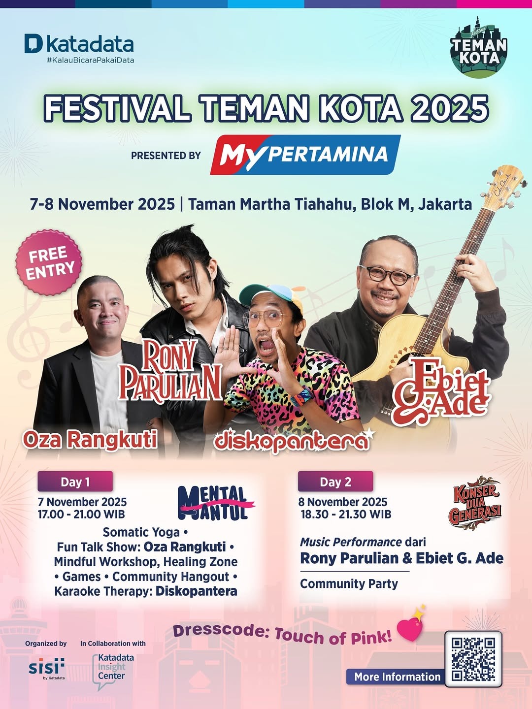 Masih di pekan yang sama, Festival Teman Kota 2025 akan berlangsung pada 7–8 November di Taman Martha Tiahahu, Blok M, Jakarta. Diselenggarakan oleh Katadata, festival ini mengusung konsep ruang publik untuk berbagi energi positif dan refleksi diri melalui musik serta kegiatan komunitas. Hari pertama bertema Mental Mantul Day menampilkan sesi Somatic Yoga, Mindful Workshop, dan Talkshow bersama Oza Rangkuti, ditutup dengan karaoke therapy bersama Diskopantera. Hari kedua bertajuk Konser Dua Generasi menghadirkan Rony Parulian dan Ebiet G. Ade, sebagai simbol pertemuan lintas zaman.