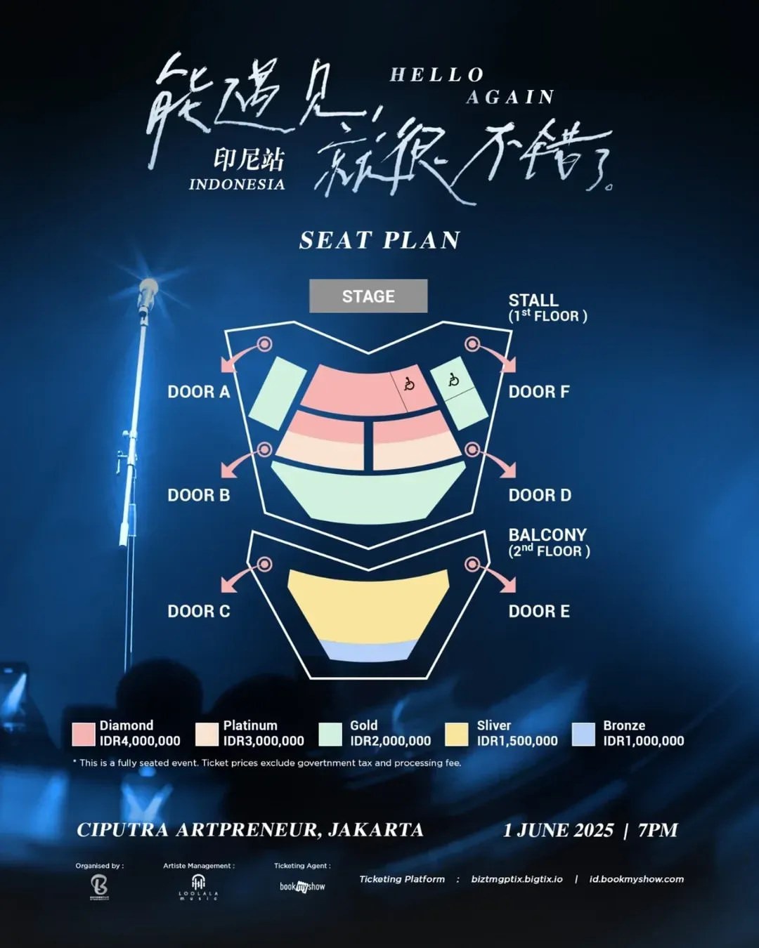 Struktur harga tiket bervariasi, dengan kategori Diamond dipatok seharga IDR 4.000.000, disusul Platinum seharga IDR 3.000.000, Gold IDR 2.000.000, Silver IDR 1.500.000, dan Bronze IDR 1.000.000. Peta tempat duduk menunjukkan bahwa area Diamond berada paling dekat dengan panggung di bagian tengah, sementara kategori Bronze terletak di balkon lantai dua. Penonton akan diarahkan ke kursi mereka melalui enam pintu masuk, yaitu Door A sampai Door F, yang terbagi antara lantai dasar (Stall) dan balkon (Balcony).