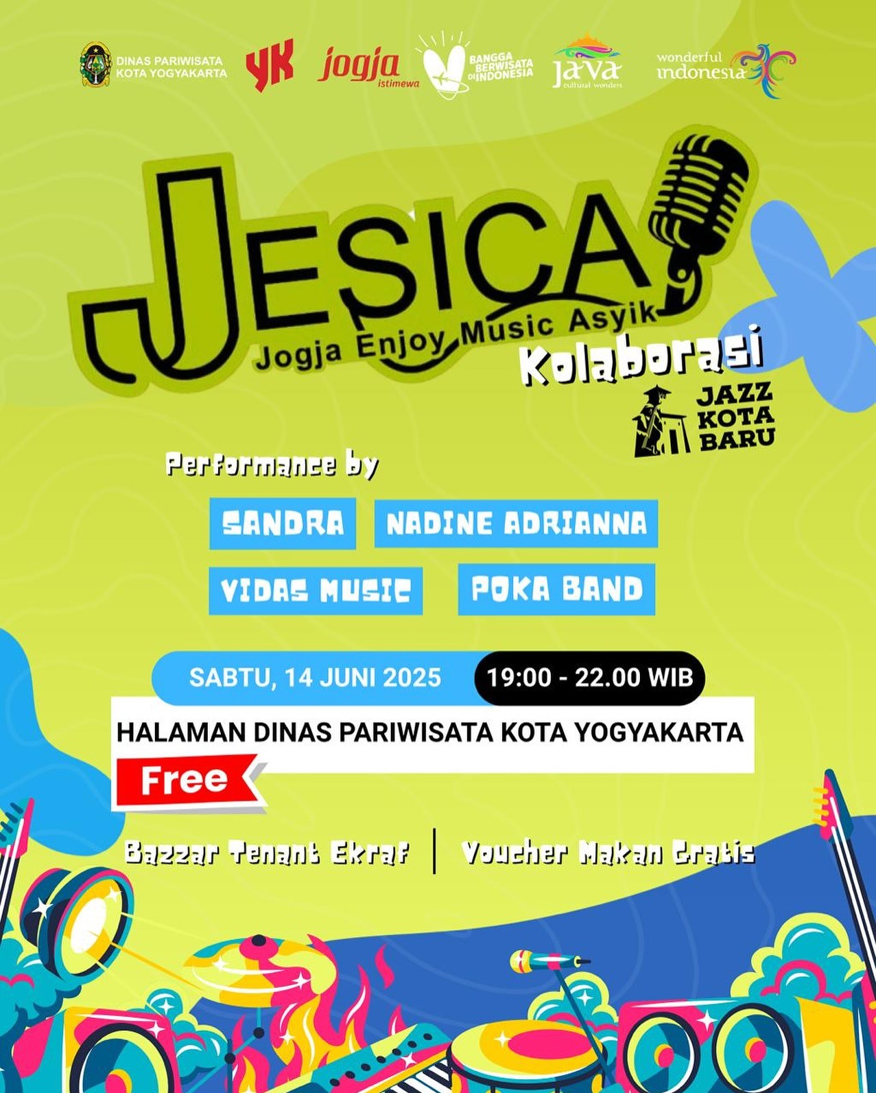 Yogyakarta, 11 Juni 2025 — Dinas Pariwisata Kota Yogyakarta kembali menjadwalkan penyelenggaraan JESICA (Jogja Enjoy Musik Asyik), sebuah program hiburan publik yang akan digelar pada Sabtu, 14 Juni 2025. Acara ini dijadwalkan berlangsung mulai pukul 19.00 hingga 22.00 WIB di Halaman Dinas Pariwisata Kota Yogyakarta.