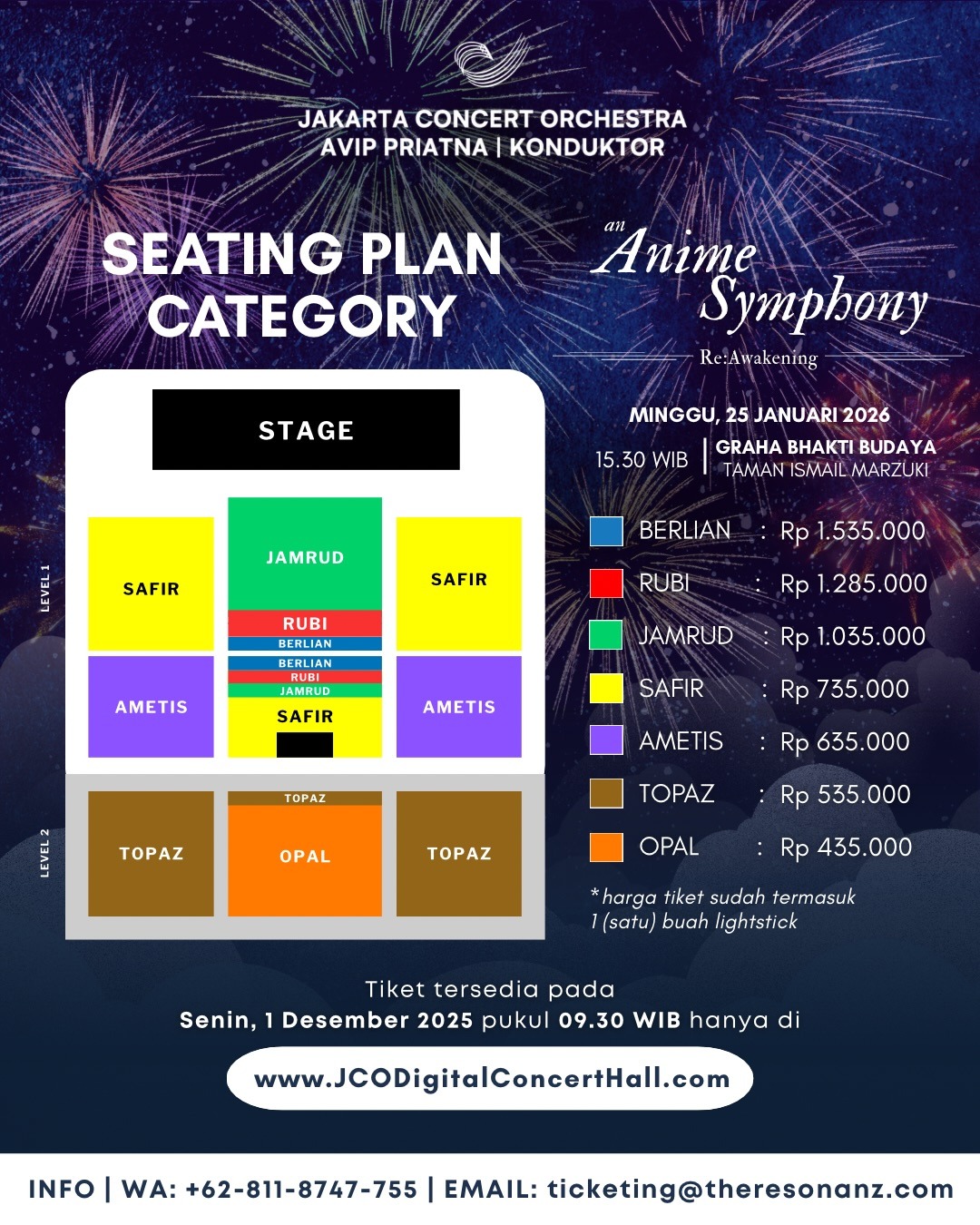 Penjualan tiket resmi dimulai pada Senin, 1 Desember 2025 pukul 09.30 WIB dan hanya tersedia melalui situs www.jcodigitalconcerthall.com. Belum ada informasi mengenai penjualan melalui kanal lain pada tahap pertama ini.