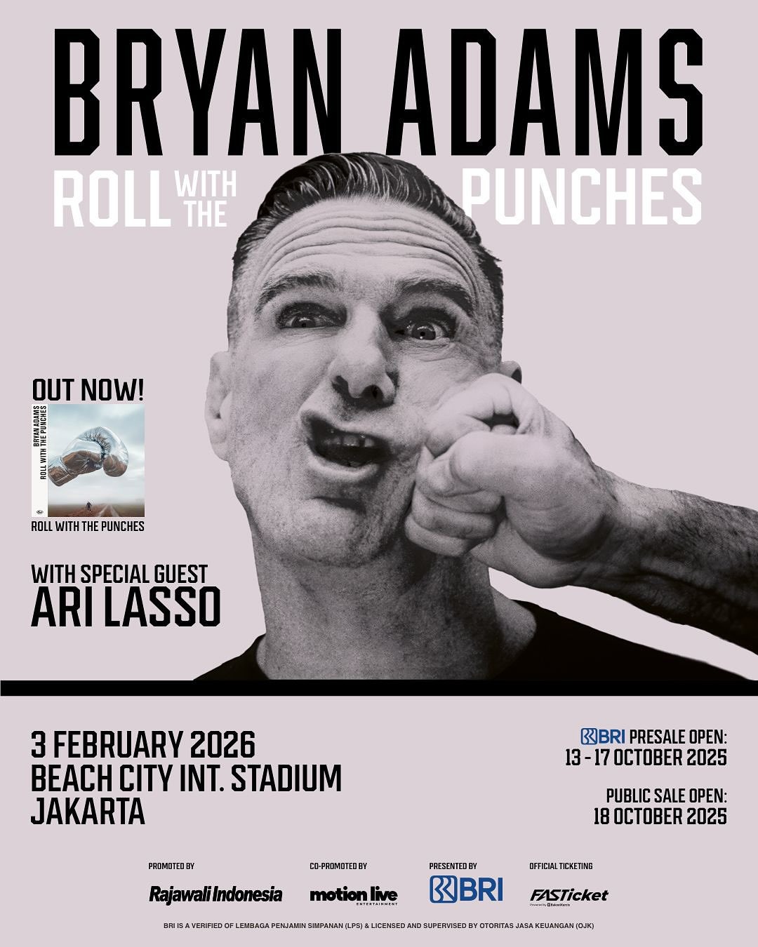 Jakarta, 8 Oktober 2025 – Musisi legendaris dunia Bryan Adams dijadwalkan tampil di Jakarta pada 3 Februari 2026 dalam konser bertajuk “Roll with Punches” yang akan menghadirkan penyanyi Indonesia Ari Lasso sebagai bintang tamu spesial. Pertunjukan ini akan berlangsung di Beach City International Stadium, menghadirkan kolaborasi antara ikon rock global dan salah satu vokalis paling dikenal di Indonesia.