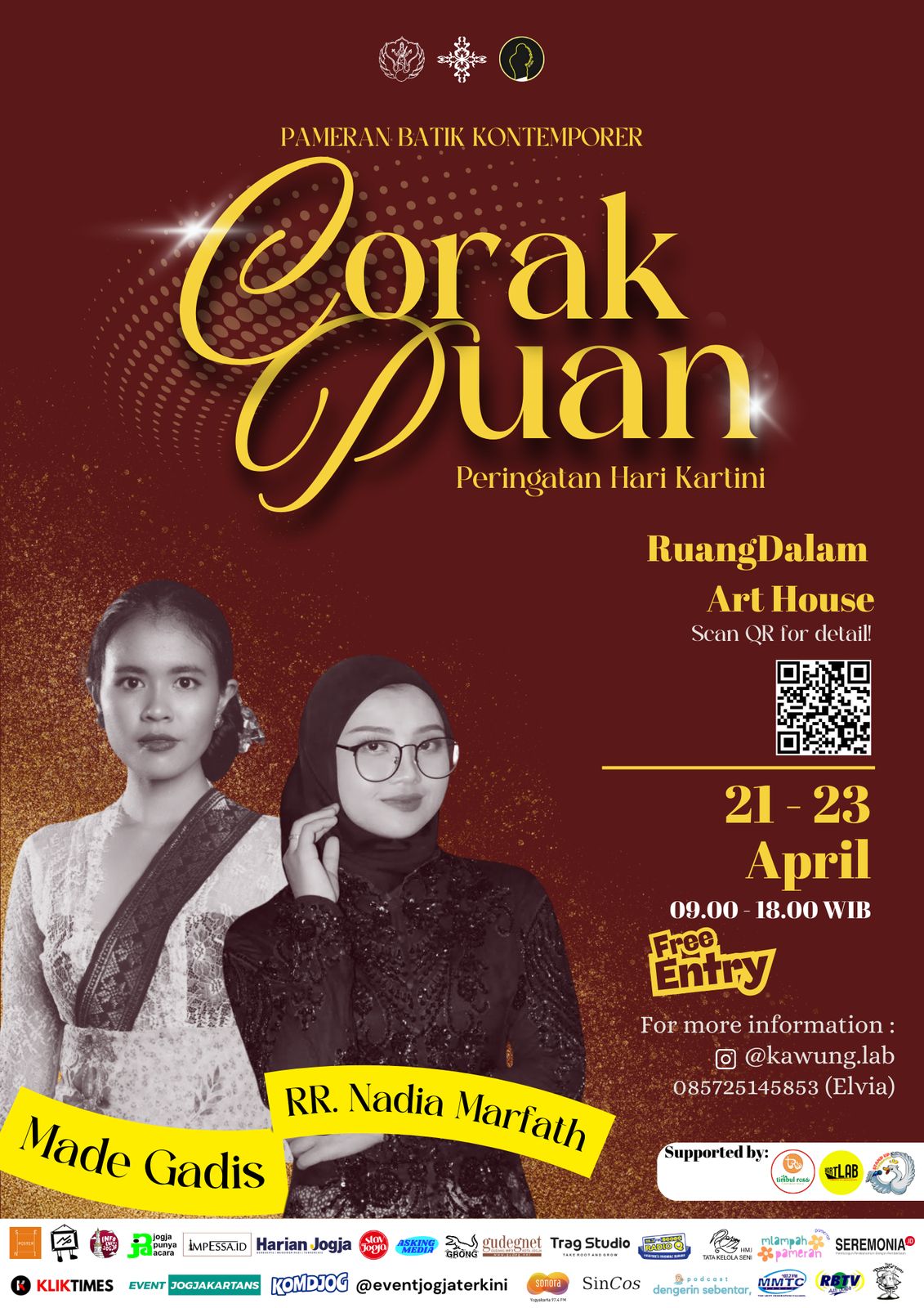 Yogyakarta, 19 April 2025 — Pameran batik kontemporer bertajuk Corak Puan digelar di RuangDalam Art House pada 21 hingga 23 April 2025. Pameran ini diselenggarakan dalam rangka memperingati Hari Kartini dan menyoroti peran batik sebagai medium ekspresi diri bagi perempuan seniman muda.