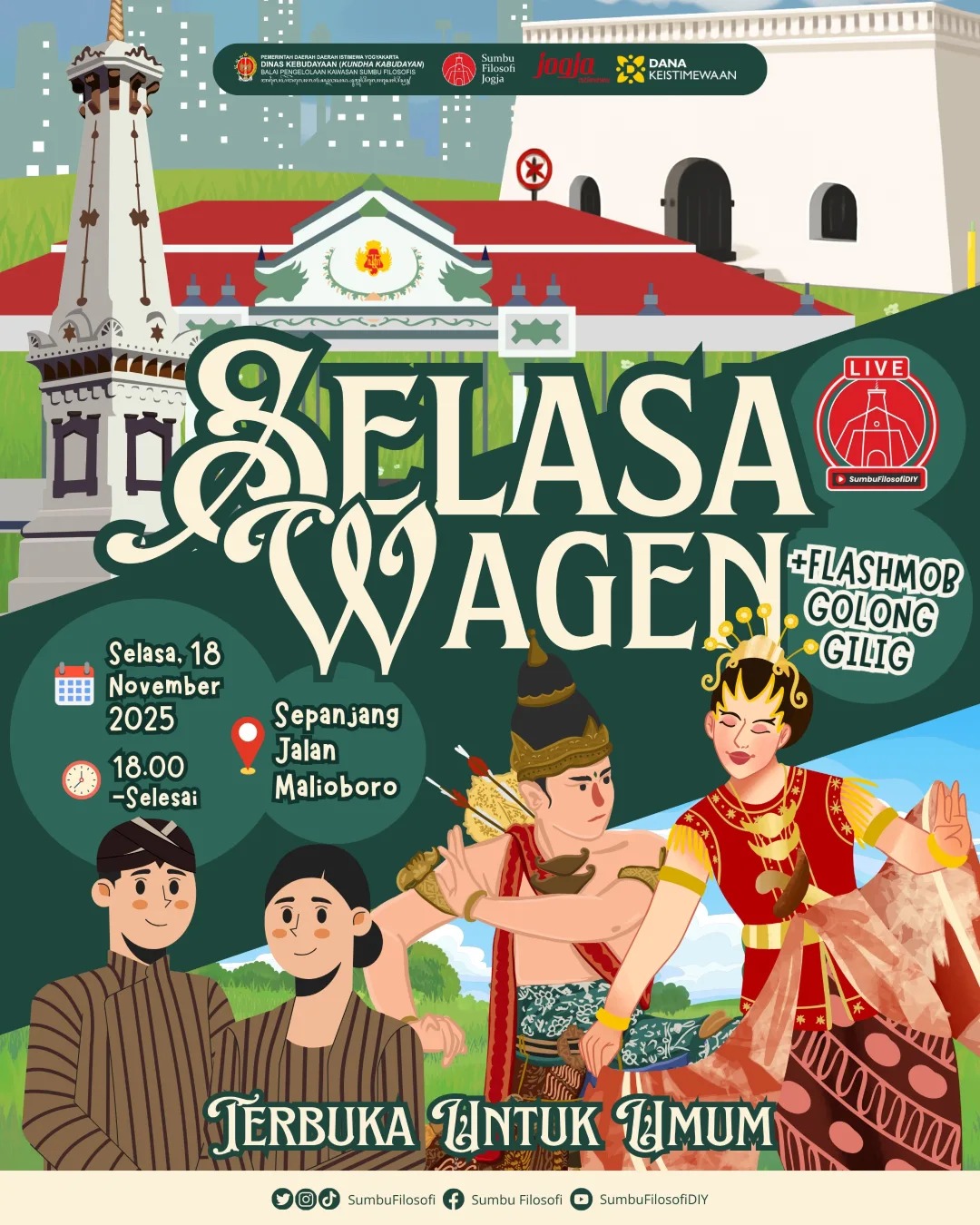 Yogyakarta, 17 November 2025 – Kegiatan Selasa Wagen dijadwalkan kembali berlangsung pada 18 November 2025 di Sepanjang Jalan Malioboro, Kawasan Sumbu Filosofi Yogyakarta. Informasi yang dibagikan di sosial media juga menegaskan bahwa rangkaian acara akan dimulai pukul 18.00 WIB hingga selesai.