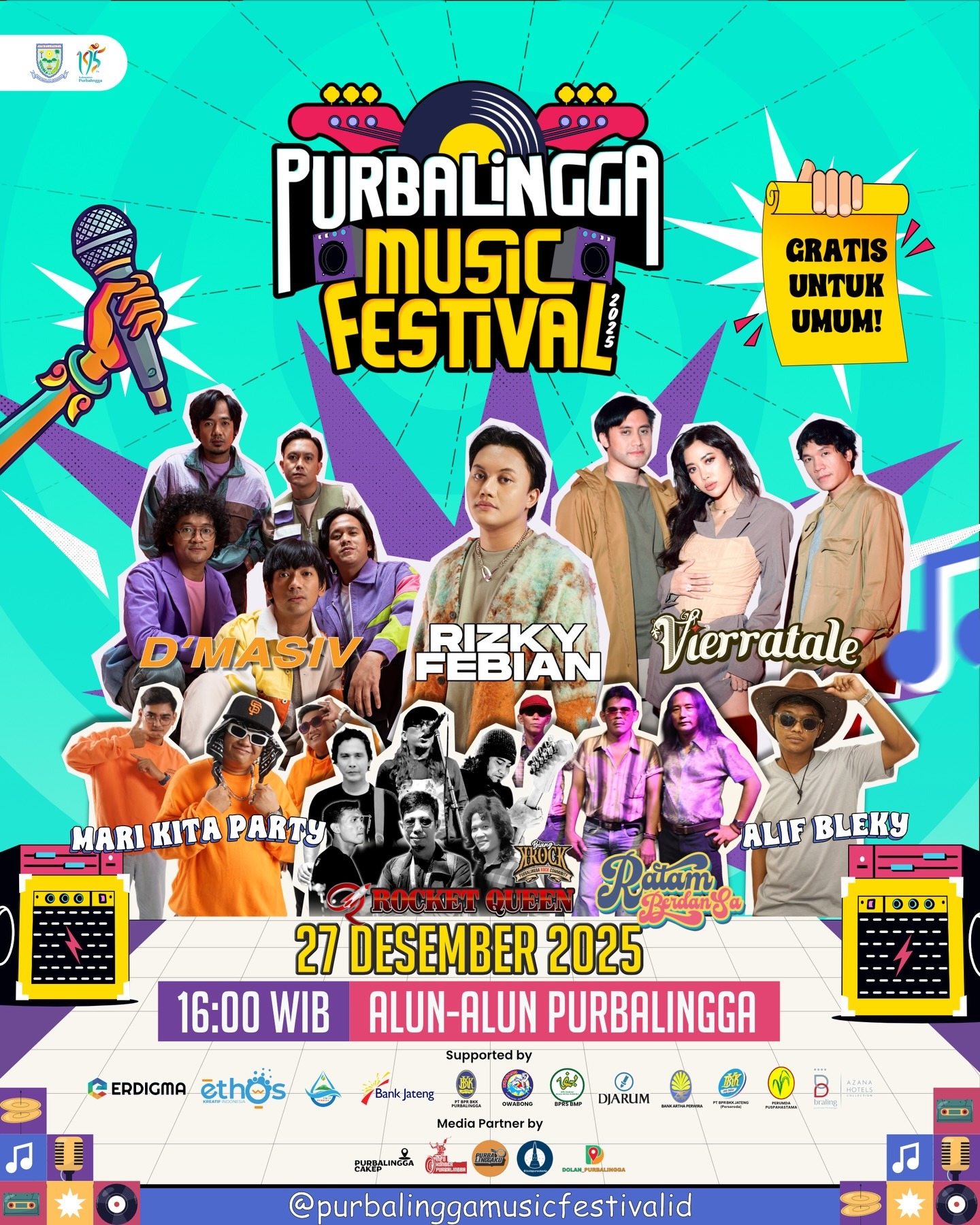 Purbalingga, 22 Desember 2025 – Kabupaten Purbalingga akan menggelar Purbalingga Music Festival 2025 pada 27 Desember 2025 mendatang di Alun-Alun Purbalingga. Acara ini merupakan bagian dari rangkaian peringatan Hari Jadi ke-195 Kabupaten Purbalingga dan terbuka gratis untuk umum.