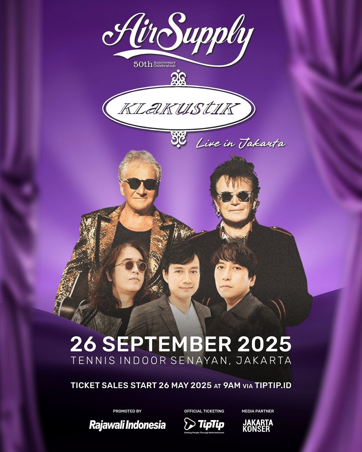 Jakarta, 23 Mei 2025 — Dua nama besar di dunia musik, Air Supply dan Klakustik, dijadwalkan akan berbagi panggung dalam sebuah konser bersama bertajuk Air Supply – Klakustik Live in Jakarta. Acara ini akan digelar pada 26 September 2025 di Tennis Indoor Senayan, Jakarta, mulai pukul 20.00 WIB.