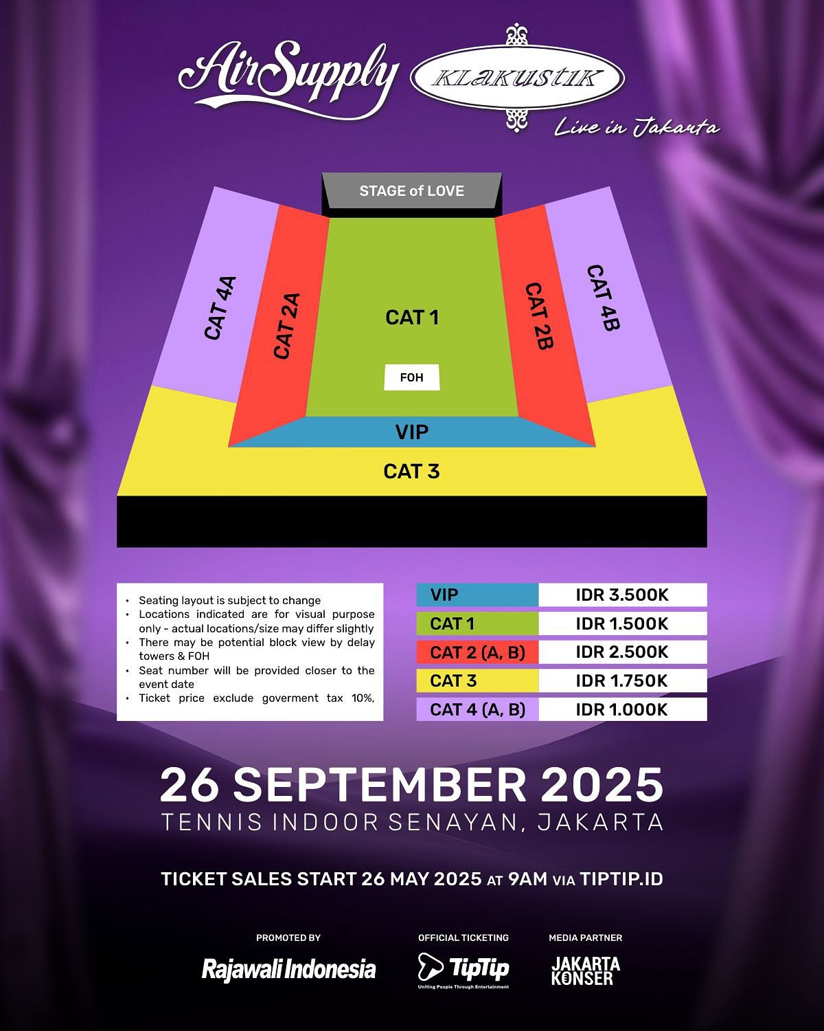 Konser ini mengusung tema “Stage of Love,” yang kemungkinan besar akan menyatukan kekuatan balada romantis khas Air Supply dengan nuansa akustik dari Klakustik. Penyelenggara telah merilis skema tempat duduk dan kategori tiket melalui media sosial, memberikan gambaran awal bagi calon penonton mengenai tata letak dan harga tiket.