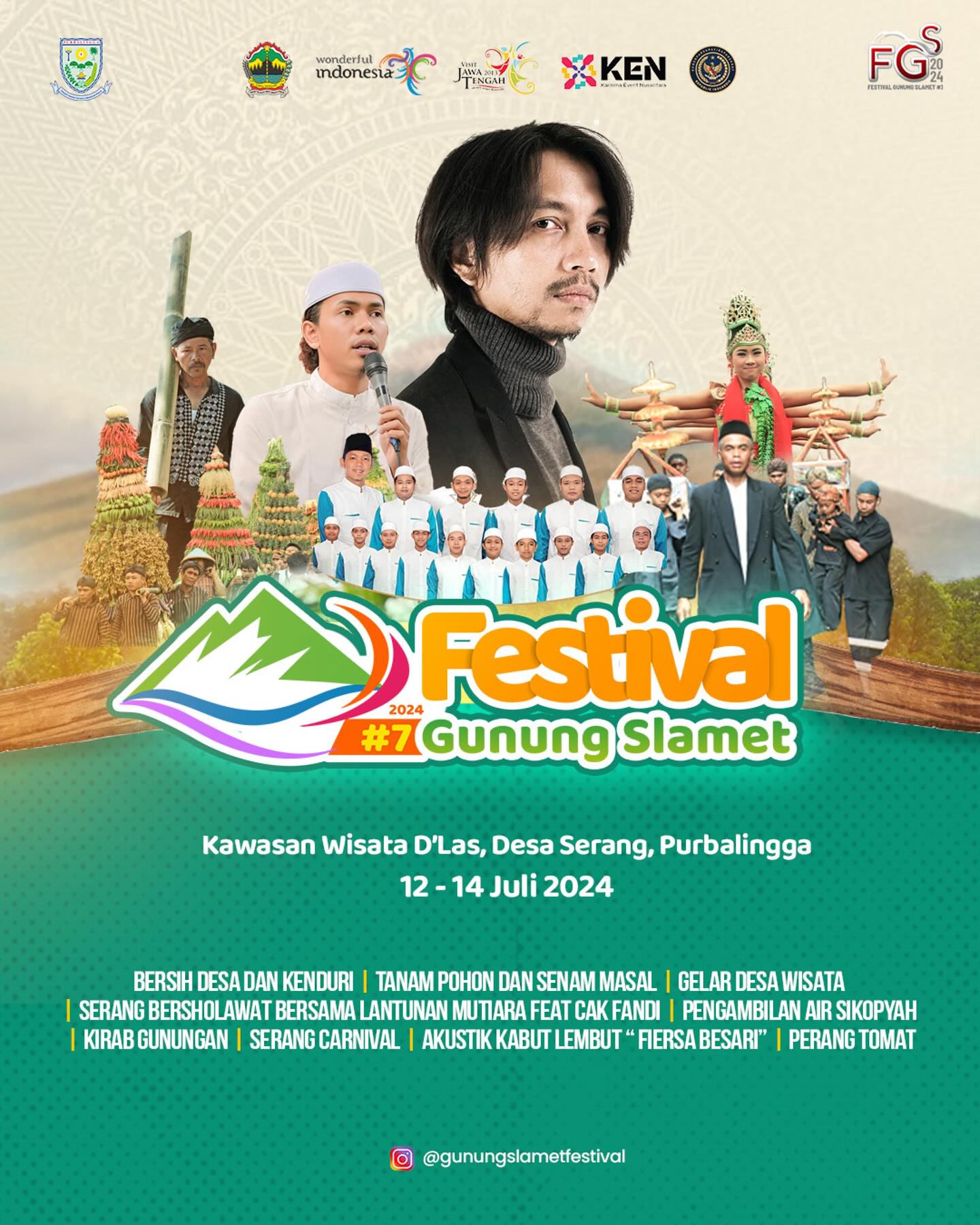 Purbalingga, 28 April 2025 – Purbalingga akan kembali menjadi tuan rumah Festival Gunung Slamet (FGS) yang ke-8 pada 4 hingga 6 Juli 2025. Acara ini akan berlangsung di Desa Wisata Serang, kawasan lereng Gunung Slamet, dan telah masuk dalam daftar Top 10 Event Jawa Tengah 2025 serta menjadi bagian dari program Karisma Event Nusantara (KEN) 2025.