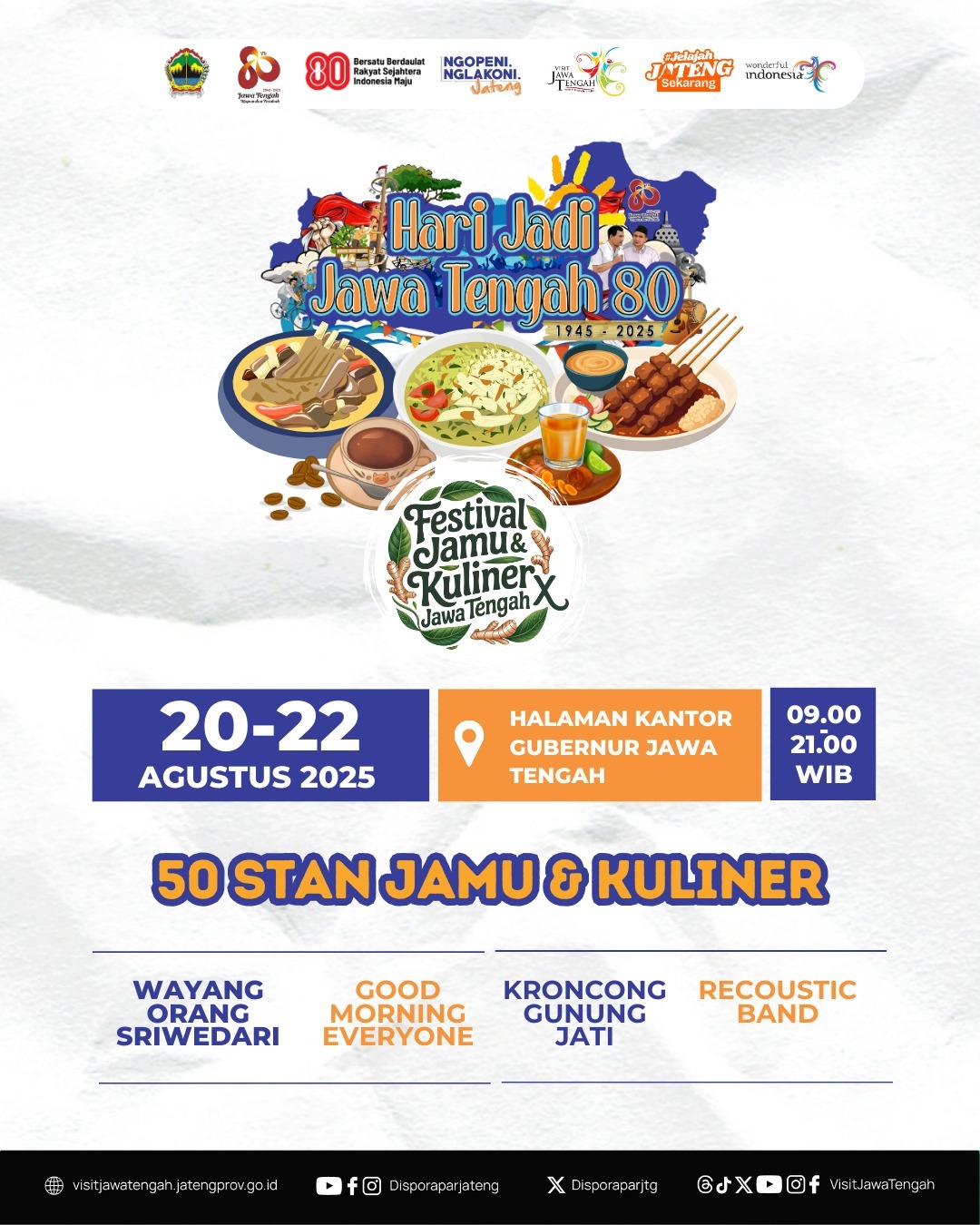 Festival Jamu dan Kuliner Jawa Tengah telah menjadi agenda tahunan yang menampilkan kekayaan tradisi minuman jamu serta ragam kuliner khas daerah. Tahun ini, kegiatan tersebut memasuki penyelenggaraan ke-10 sekaligus menjadi bagian dari perayaan usia ke-80 provinsi.