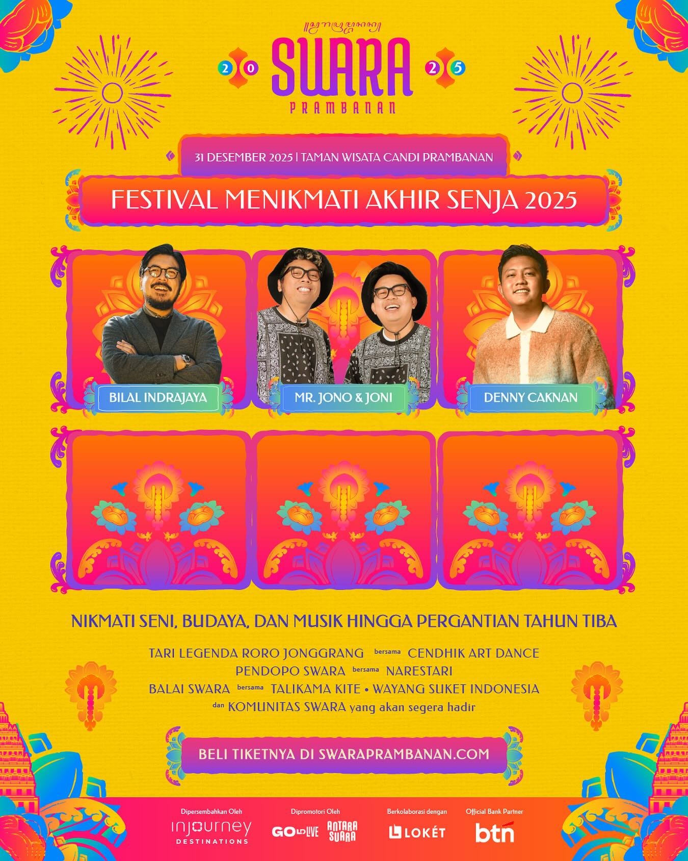 Yogyakarta, 24 Juli 2025 โ Menjelang pergantian tahun, kawasan Taman Wisata Candi Prambanan akan menjadi tuan rumah perhelatan seni dan budaya bertajuk Festival Menikmati Akhir Senja 2025, yang dijadwalkan berlangsung pada 31 Desember 2025. Acara ini menggabungkan elemen musik, tari, dan teater dalam satu malam pertunjukan terbuka, melibatkan sejumlah seniman tanah air lintas genre.
