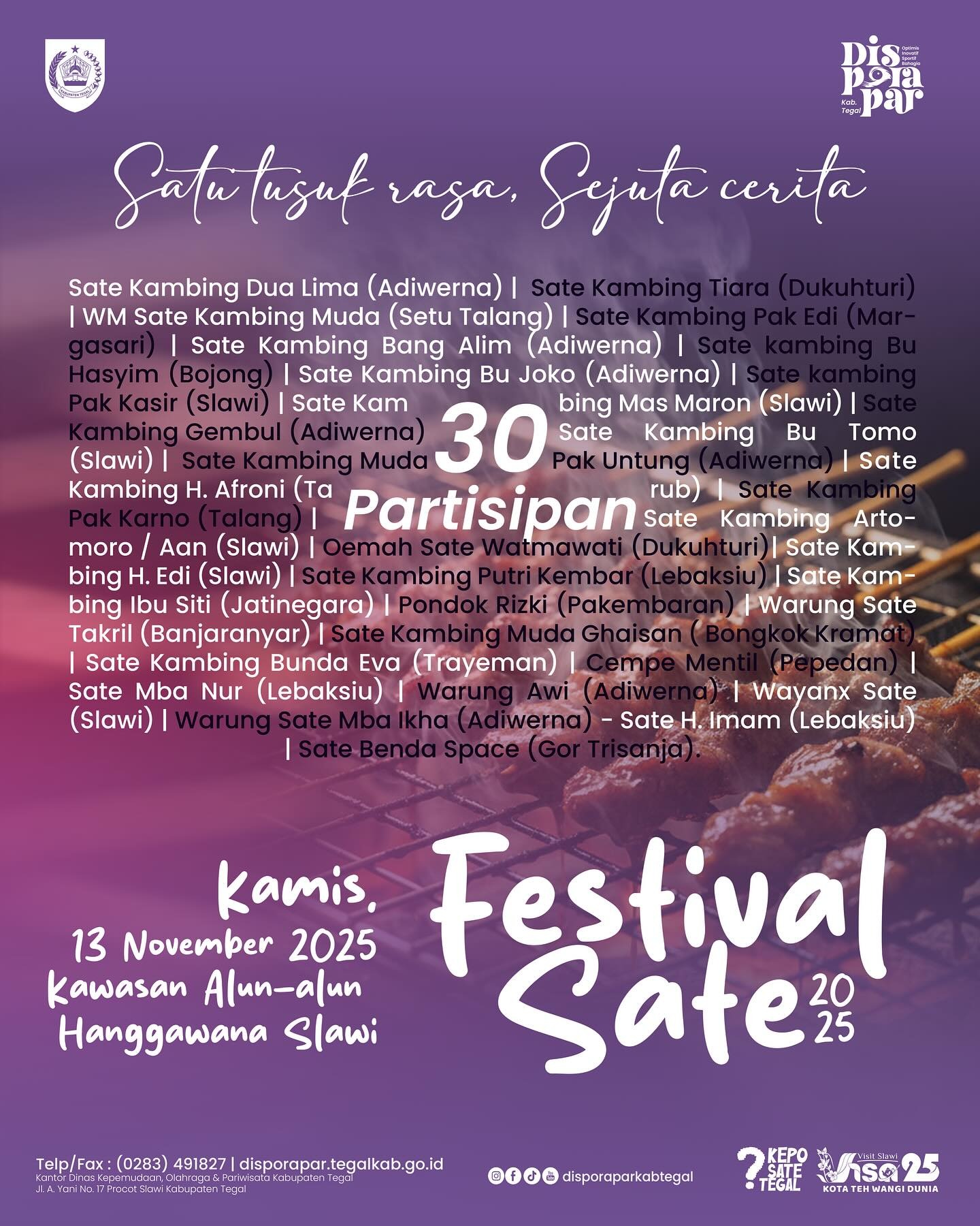 Informasi lebih lanjut dapat diakses melalui akun media sosial resmi Festival Sate Tegal 2025 atau situs webnya.