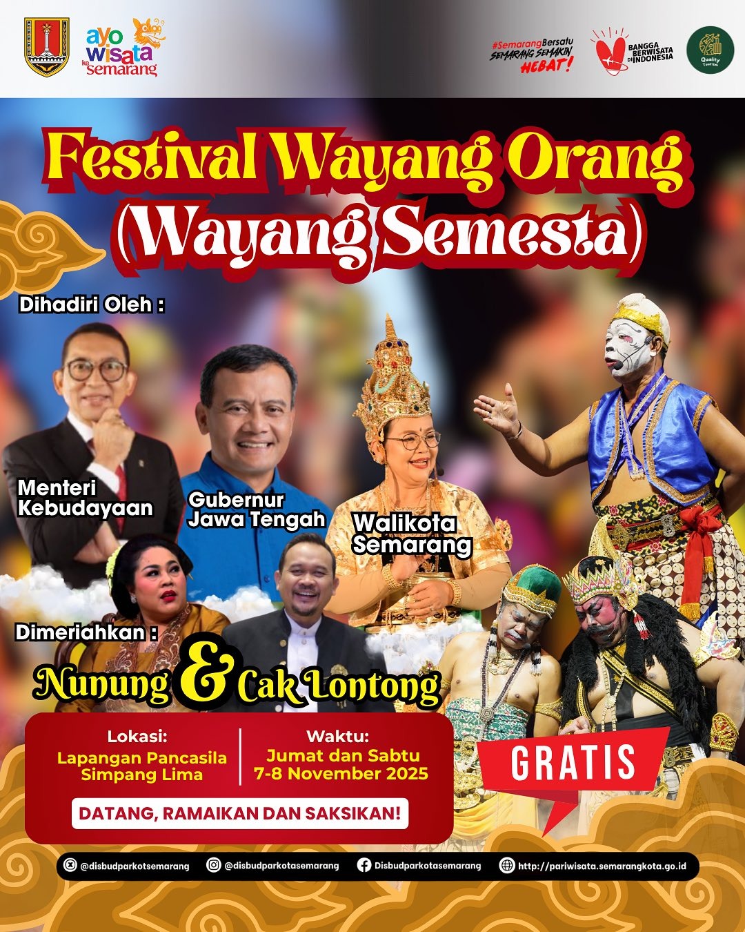 Semarang, 4 November 2025 — Dalam rangka memperingati Hari Wayang Nasional yang jatuh pada 7 November, Pemerintah Kota Semarang melalui Dinas Kebudayaan dan Pariwisata kembali menggelar Festival Wayang Orang (Wayang Semesta). Acara besar ini akan berlangsung selama dua hari, pada 7–8 November 2025 di Lapangan Pancasila, Simpang Lima, Semarang, dan terbuka untuk umum tanpa biaya masuk.