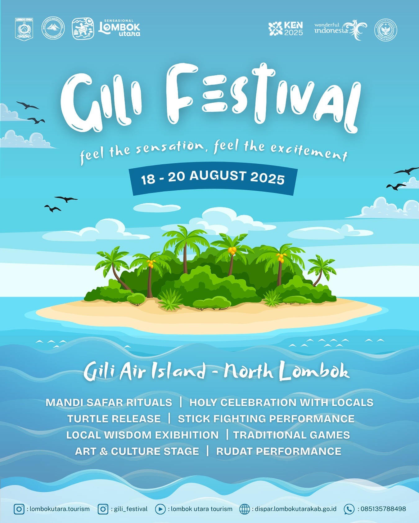 Lombok Utara, 11 Agustus 2025 – Gili Festival 2025 akan berlangsung pada 18–20 Agustus 2025 di Gili Air, salah satu dari tiga pulau utama di Kepulauan Gili, Nusa Tenggara Barat. Festival tahunan ini akan menampilkan rangkaian kegiatan budaya, seni, dan pelestarian lingkungan yang melibatkan masyarakat setempat dan pengunjung dari berbagai daerah.