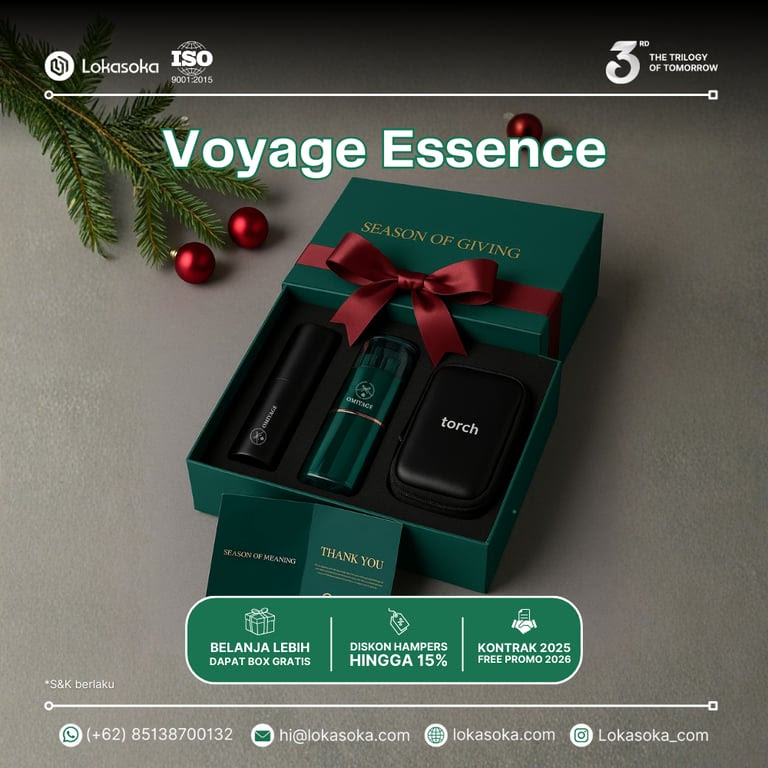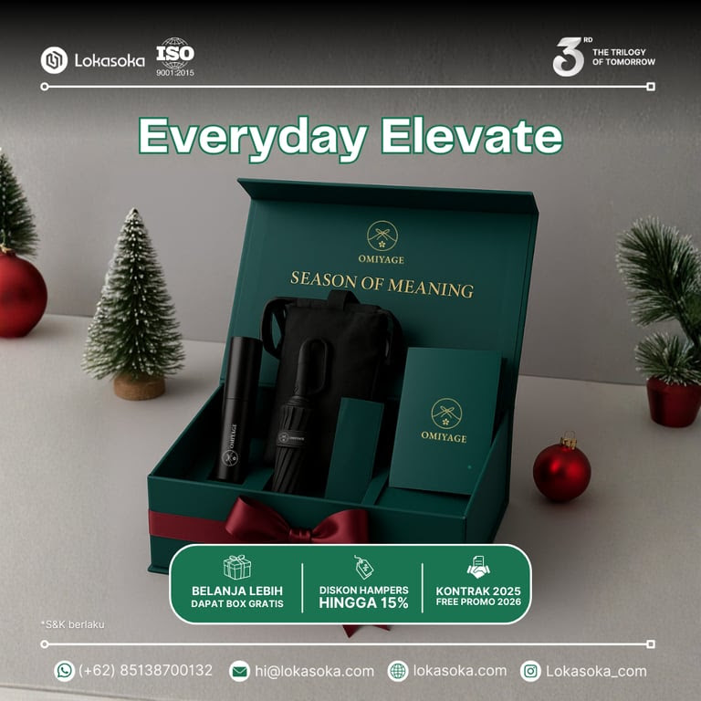 Lokasoka, sebagai platform kustomisasi hadiah bersertifikasi ISO 9001:2015, menghadirkan paket NATARU (Natal dan Tahun Baru) eksklusif di bawah brand Omiyage. Koleksi “Season of Meaning” ini didesain sebagai “Gifts That Speak Gratitude”, memadukan produk-produk premium dalam box hampers Natal berwarna hijau tua (Emerald Green) yang elegan dan mewah.