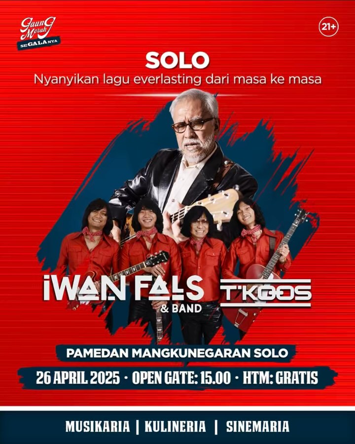 Solo, 15 April 2025 — Musisi legendaris Iwan Fals dijadwalkan menggelar konser gratis di Kota Solo pada 26 April 2025 mendatang. Konser ini merupakan bagian dari tur nasional bertajuk “Gaung Merah SeGALAnya”, yang digelar di 25 kota di seluruh Indonesia.
