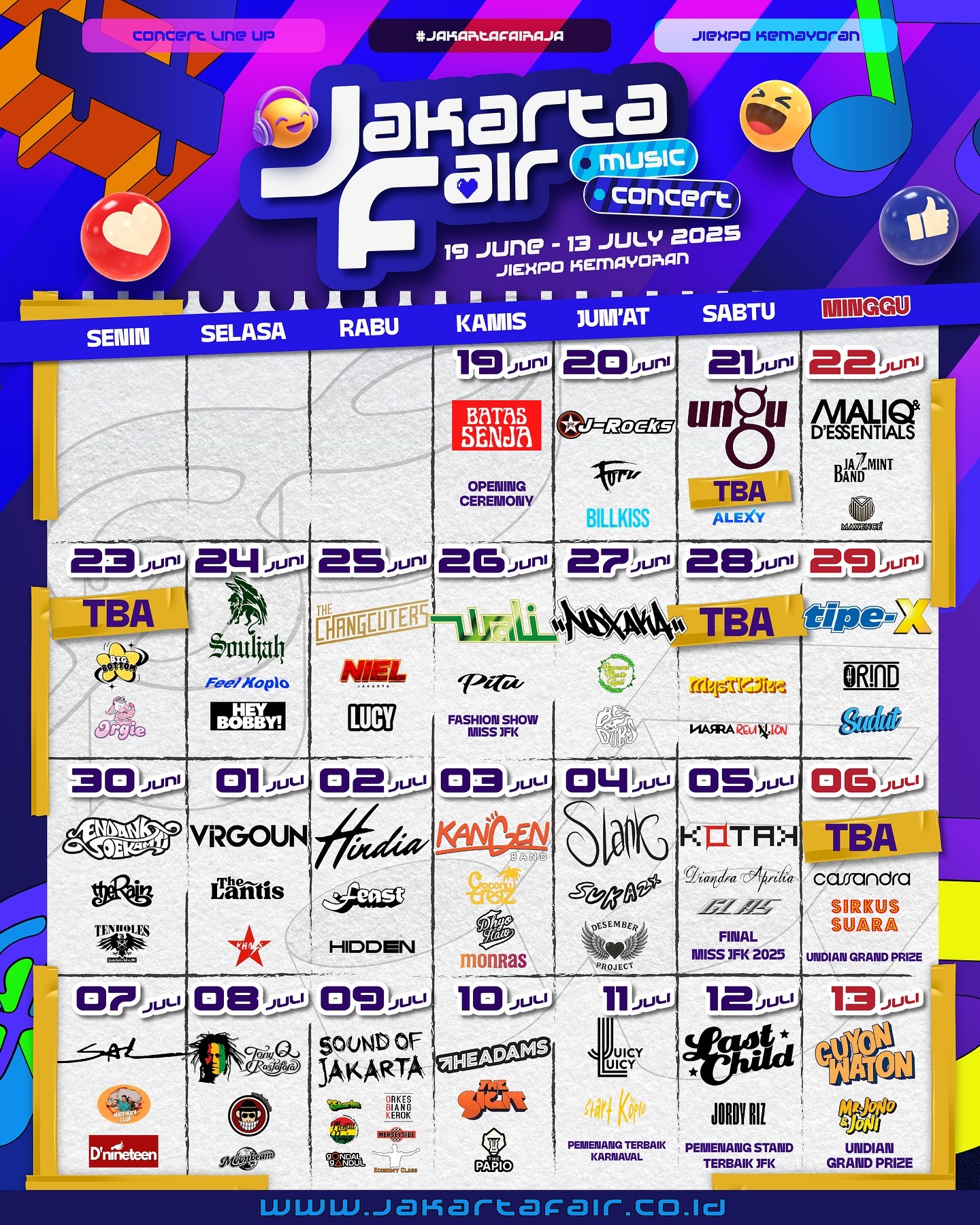 - Jumat, 11 Juli 2025: Juicy Luicy, Start Koplo, Pengumuman Pemenang Terbaik Karnaval JFK 2025