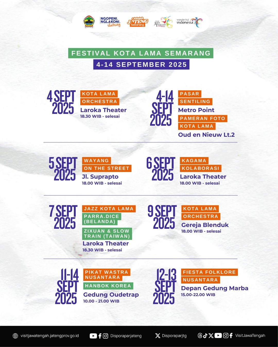 Pada 5 September, Jalan Suprapto akan menjadi lokasi pertunjukan Wayang Orang on the Street mulai pukul 18.00 WIB. Kegiatan ini membawa seni tradisional ke ruang publik Kota Lama.