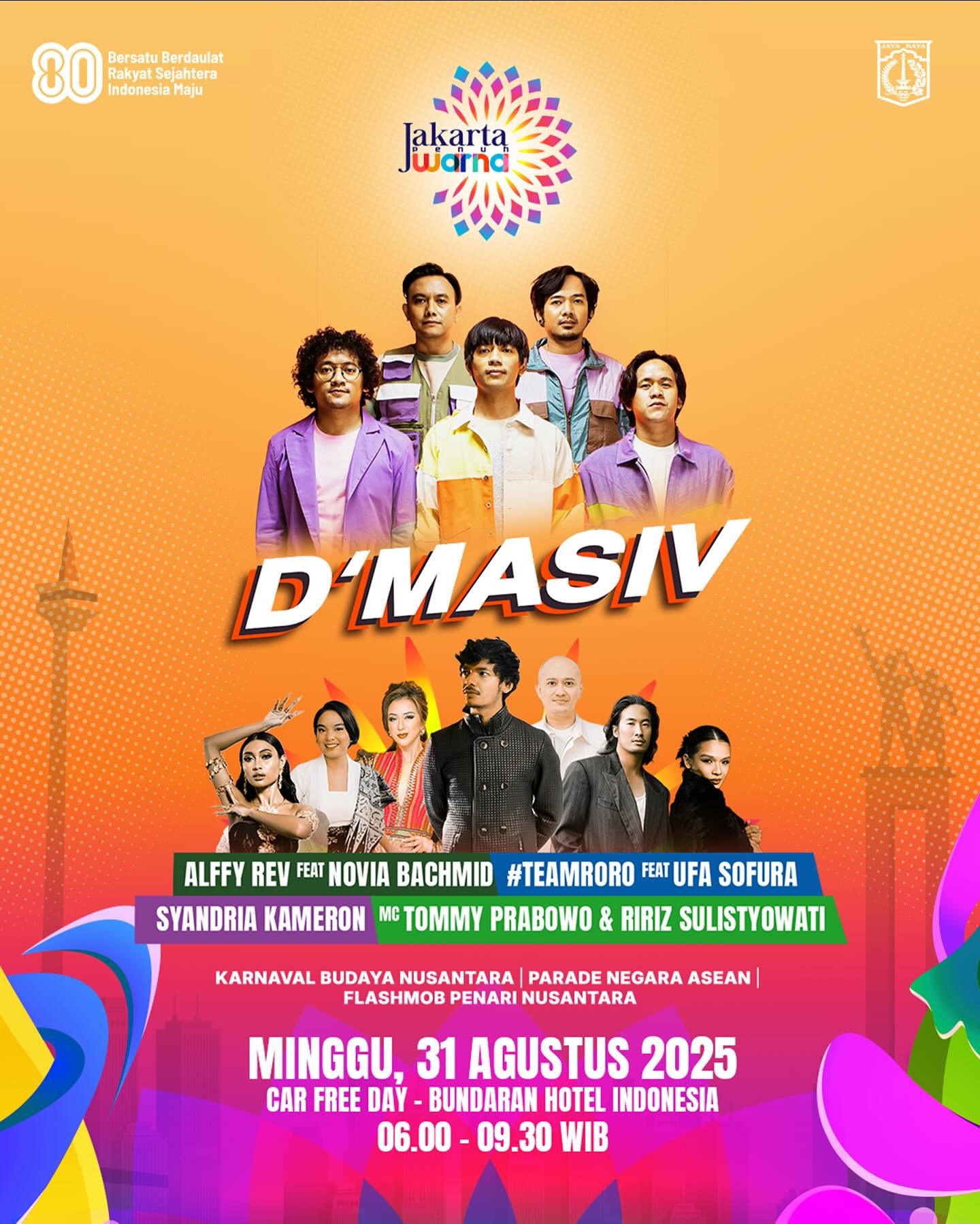 Jakarta Penuh Warna 2025 akan menampilkan perayaan budaya, seni, dan musik yang menghadirkan ribuan penampil serta sejumlah artis nasional di pusat kota Jakarta, berlangsung pada 31 Agustus 2025 di Bundaran HI, dan diproyeksikan menjadi salah satu peristiwa budaya terbesar di ibu kota pada tahun ini.