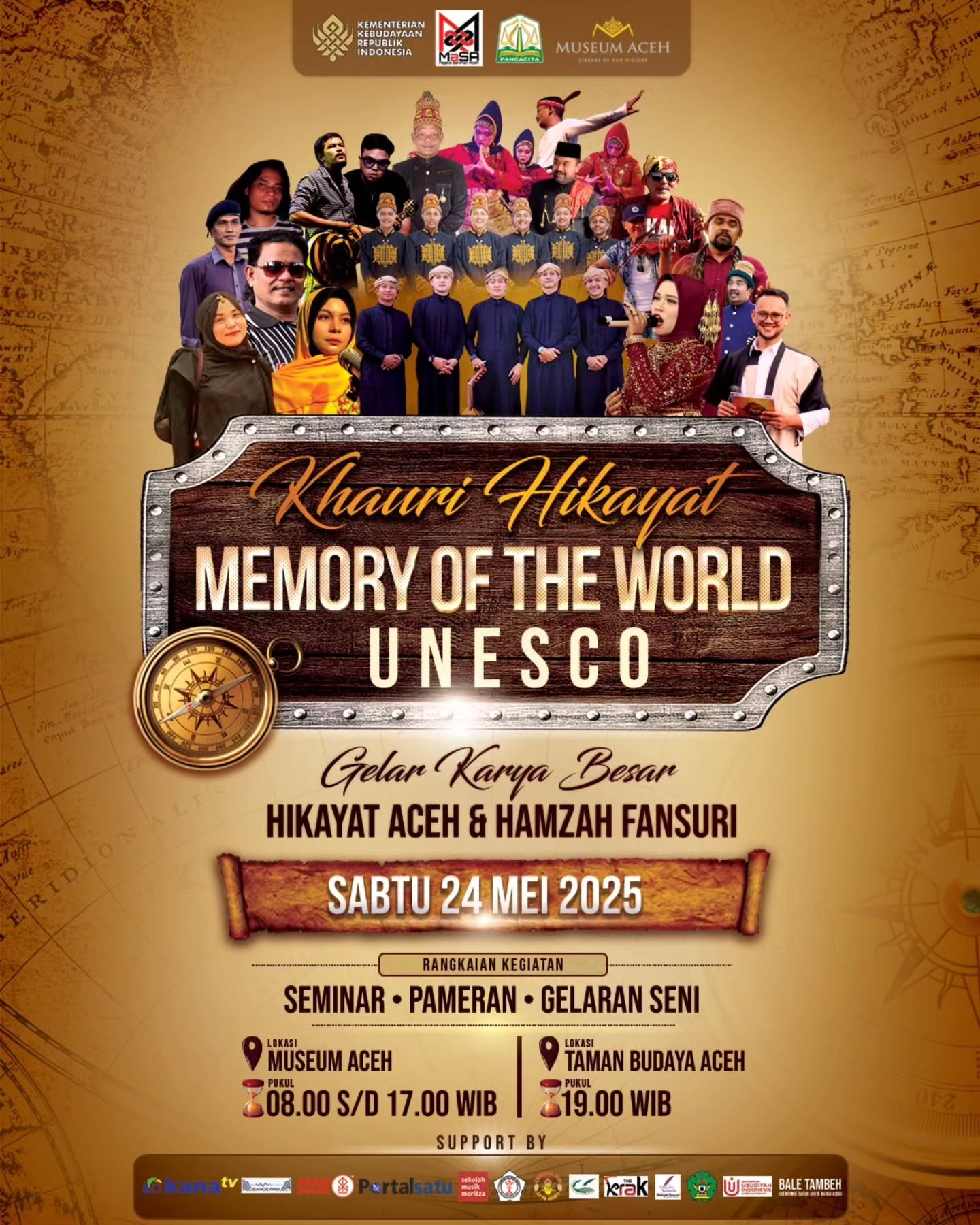 24 Mei 2025 – Banda Aceh. Sebuah gelaran seni bertajuk Khauri Hikayat: Memory of the World – UNESCO dijadwalkan berlangsung pada malam ini, Sabtu, 24 Mei 2025, mulai pukul 19.00 WIB di Arena Taman Budaya, Banda Aceh. Acara ini diinisiasi oleh Majelis Seniman Aceh, bekerja sama dengan Museum Aceh, Taman Seni dan Budaya Aceh, Dinas Kebudayaan dan Pariwisata Aceh, serta Balai Pelestarian Kebudayaan Wilayah I.