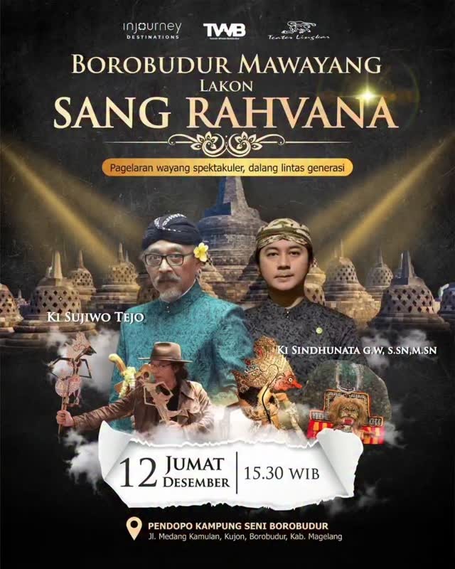 Magelang, 4 Desember 2025 – Informasi mengenai pertunjukan Borobudur Mawayang: Lakon Sang Rahvana kembali disampaikan melalui pengumuman resmi yang menegaskan jadwal pementasan pada 12 Desember pukul 15.30 WIB di Pendopo Kampung Seni Borobudur, Jl. Medang Kamulan, Kujon, Borobudur, Kabupaten Magelang. Pertunjukan ini dihadirkan sebagai sajian budaya yang menempatkan kembali kisah Rahvana di tengah suasana kawasan Borobudur.