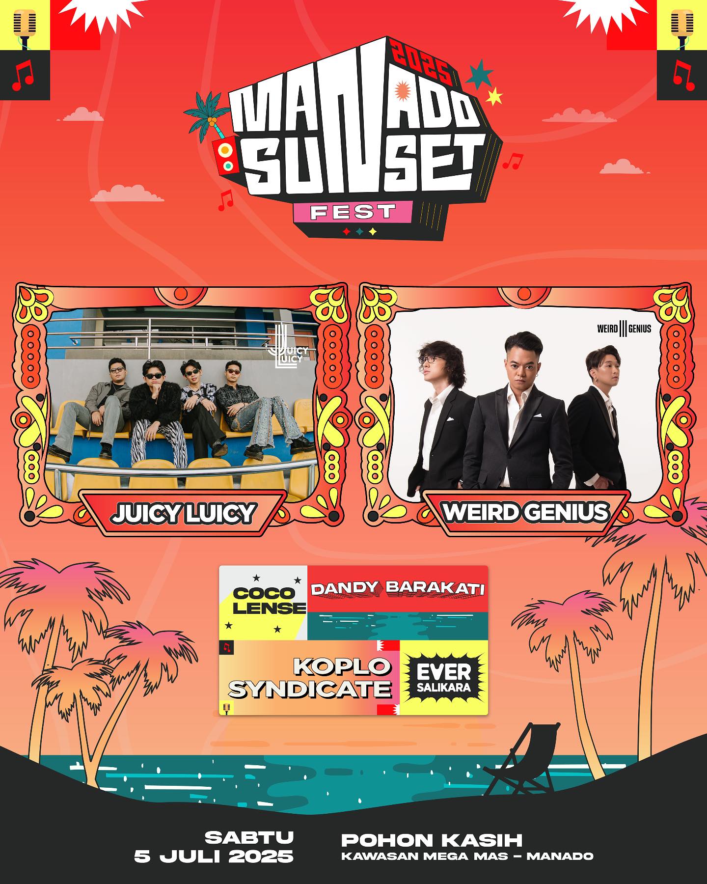 Manado, 6 Mei 2025 — Kota Manado akan menjadi tuan rumah sebuah konser musik besar pada pertengahan tahun ini. Acara bertajuk Manado Sunset Fest 2025 dijadwalkan berlangsung pada 5 Juli 2025, mengambil tempat di kawasan terbuka Pohon Kasih, Mega Mas, Manado. Festival ini akan dimulai pukul 15.00 WITA dan berlanjut hingga malam hari.