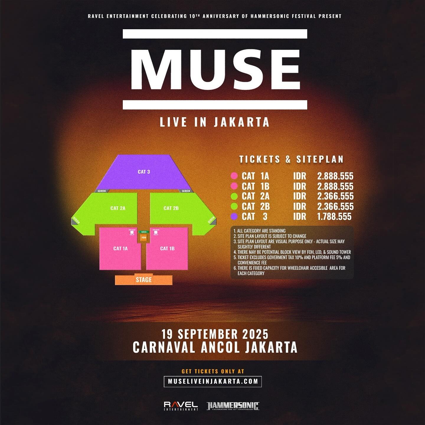 Site plan acara menunjukkan bahwa panggung akan berada di bagian selatan area konser, dengan kategori CAT 1A dan CAT 1B berada paling dekat dengan panggung. Area kategori CAT 2A dan CAT 2B menempati posisi di tengah, sementara CAT 3 terletak di bagian paling belakang. Terdapat kemungkinan adanya gangguan visual dari menara suara, peralatan LED, dan FOH (Front of House).