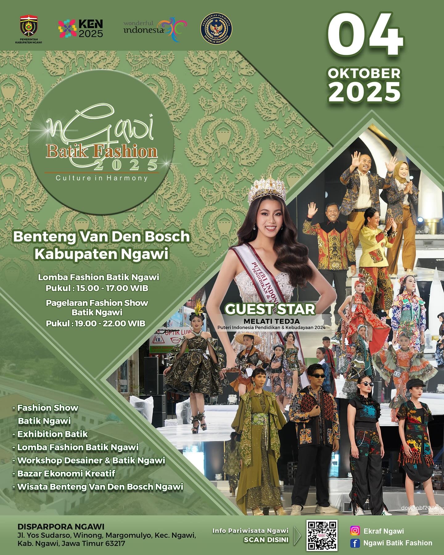 Ngawi, 3 Oktober 2025 – Perayaan Ngawi Batik Fashion 2025 akan digelar di Benteng Van Den Bosch, Ngawi, pada Sabtu, 4 Oktober 2025. Agenda ini hadir dengan mengusung tema Culture in Harmony, menekankan perpaduan antara warisan budaya dan kreativitas mode busana masa kini.