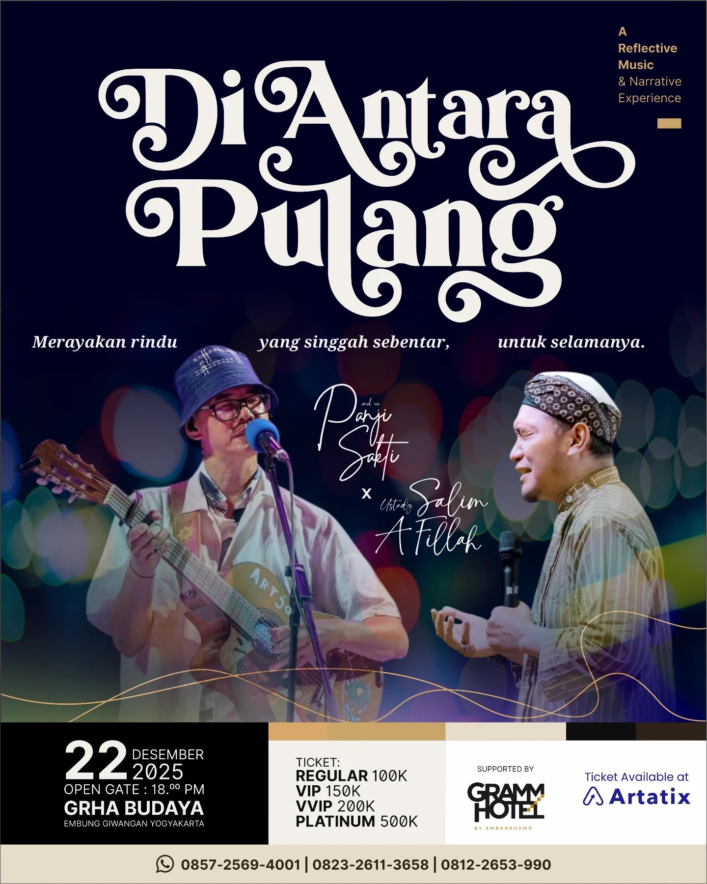 Yogyakarta, 1 Desember 2025 – Sebuah pengalaman musik dan refleksi spiritual bertajuk “Di Antara Pulang” akan digelar pada Senin, 22 Desember 2025, di Graha Budaya Embung Giwangan, Kota Yogyakarta. Acara yang menghadirkan Panji Sakti bersama Ustadz Salim A. Fillah ini dijadwalkan berlangsung mulai pukul 15.00 hingga 23.00 WIB.