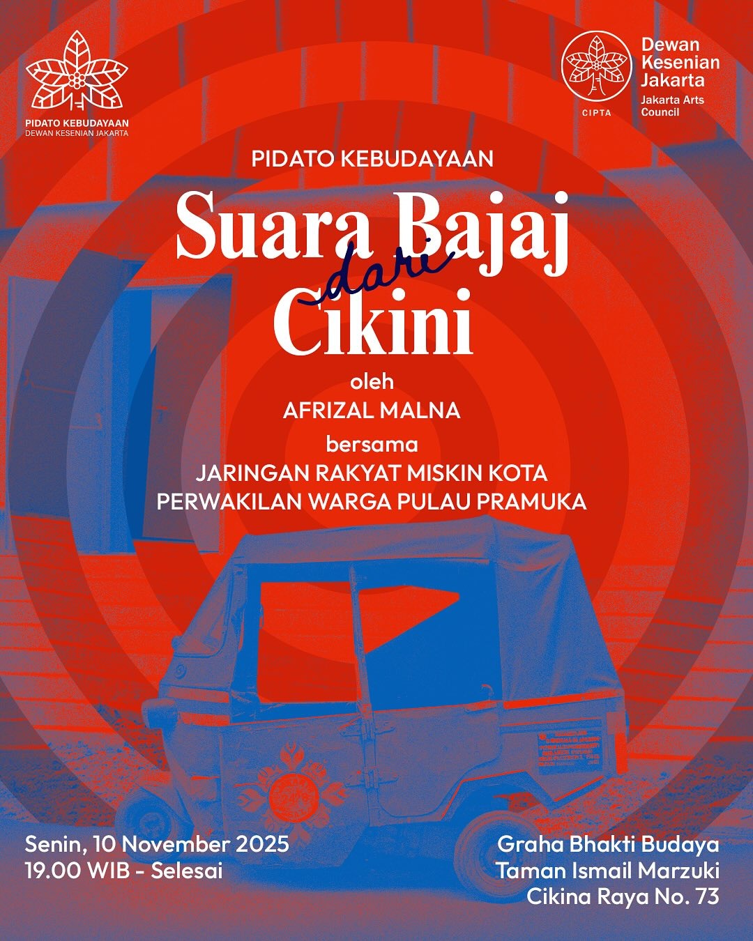 Pidato tahun ini bertajuk “Suara Bajaj dari Cikini”, menampilkan Afrizal Malna, sastrawan terkemuka Indonesia, yang akan mengulas perjalanan dan perubahan Jakarta melalui kenangan masa kecilnya. Refleksi tersebut dituangkan lewat kisah transportasi kota seperti becak dan bajaj, yang dalam narasi Afrizal menjadi simbol dinamika sosial serta upaya kota meneguhkan identitas globalnya tanpa meninggalkan nilai keseharian warganya.
