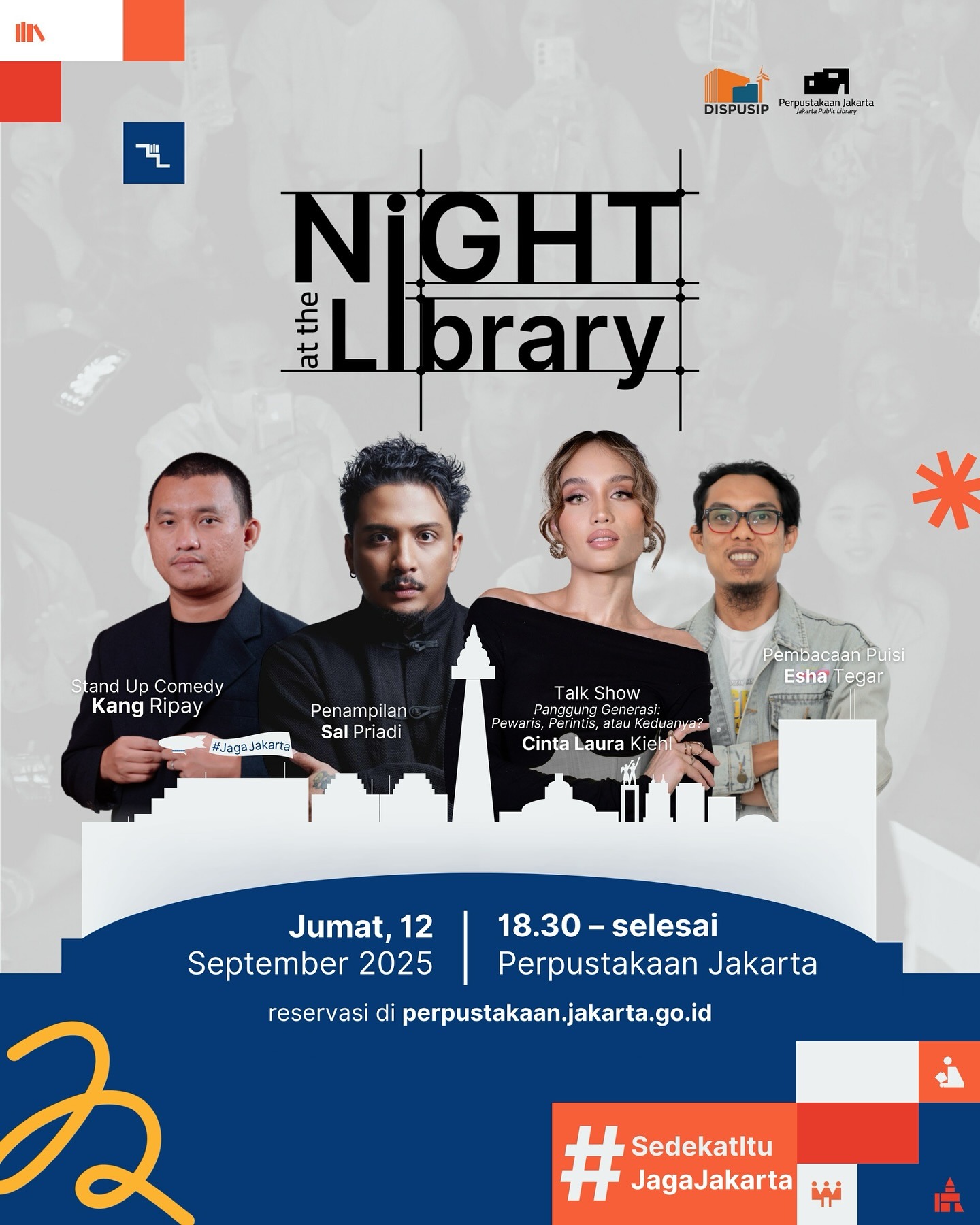 Jakarta, 10 September 2025 – Perpustakaan Jakarta akan kembali menggelar program Night at the Library pada Jumat, 12 September 2025. Acara ini dijadwalkan berlangsung mulai pukul 18.30 WIB hingga selesai, dengan rangkaian kegiatan yang menggabungkan diskusi, musik, komedi, dan puisi.