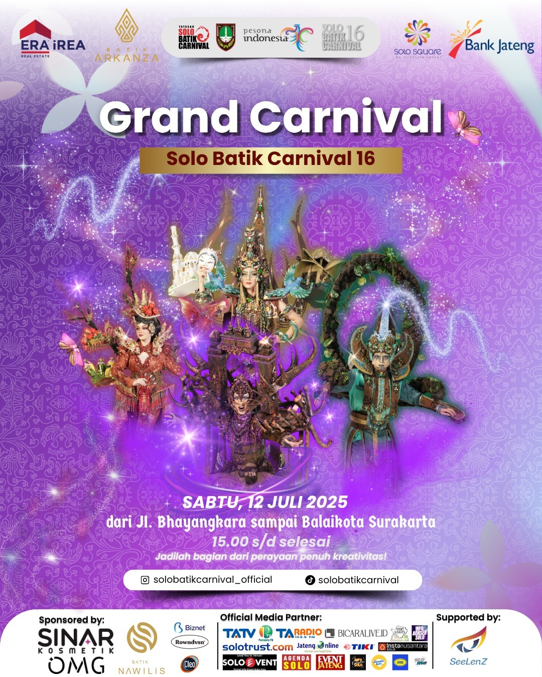 Surakarta, 10 Juli 2025 – Pemerintah Kota Surakarta akan menggelar puncak acara Solo Batik Carnival ke-16 pada Sabtu, 12 Juli 2025. Acara bertajuk Grand Carnival ini akan berlangsung di sepanjang Jalan Bhayangkara hingga kawasan Balaikota Surakarta, mulai pukul 15.00 WIB hingga selesai.