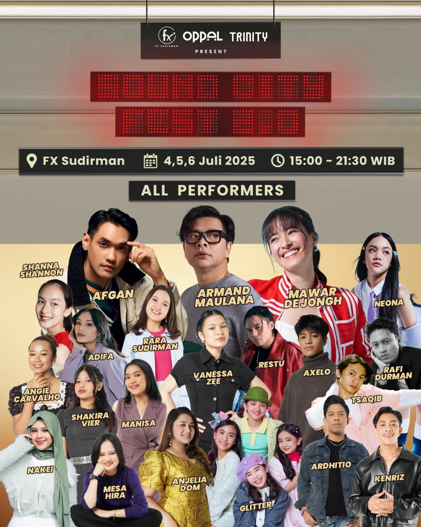 Jakarta, 4 Juli 2025 — Gelaran musik tahunan Sound City Fest kembali digelar tahun ini di FX Sudirman, Jakarta. Bertajuk Sound City Fest 2.0, acara ini dijadwalkan berlangsung selama tiga hari berturut-turut mulai tanggal 4 hingga 6 Juli 2025. Berdasarkan informasi yang dibagikan melalui media sosial, festival ini akan menghadirkan deretan musisi dari berbagai latar belakang genre dan usia.