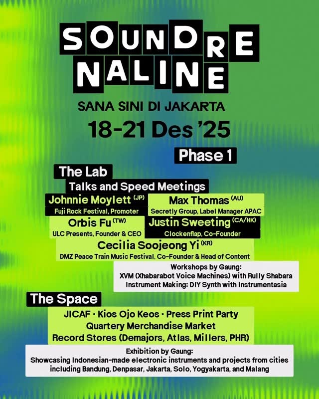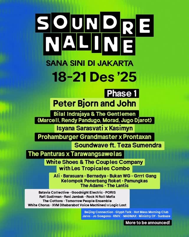 Jakarta, 11 November 2025 – Soundrenaline Sana Sini di Jakarta akan berlangsung pada 18–21 Desember 2025 di Jakarta, Indonesia. Acara ini merupakan edisi terbaru dari festival musik tahunan Soundrenaline, yang dikenal sebagai salah satu perhelatan musik lintas genre terbesar di Tanah Air. Berdasarkan pengumuman di akun resmi @soundrenaline.id, festival ini akan menjadi ajang bagi penonton berusia 21 tahun ke atas.