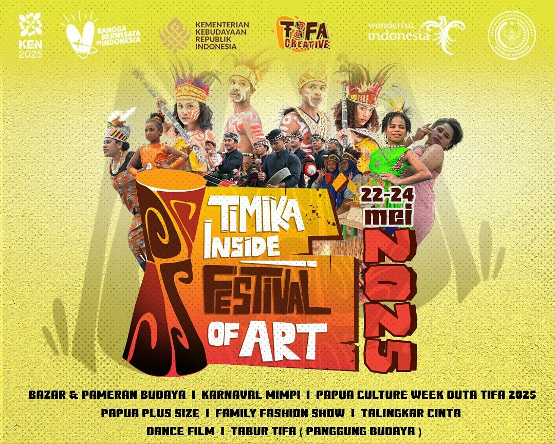 Timika, 5 Mei 2025 — Festival seni dan budaya dari tanah Papua akan kembali digelar tahun ini melalui perhelatan Timika Inside Festival of Art (TIFA) 2025. Acara ini merupakan salah satu event tahunan dari Provinsi Papua Tengah yang telah masuk dalam daftar Karisma Event Nusantara (KEN) 2025, program dari Kementerian Pariwisata untuk mendukung pariwisata serta ekonomi kreatif daerah.