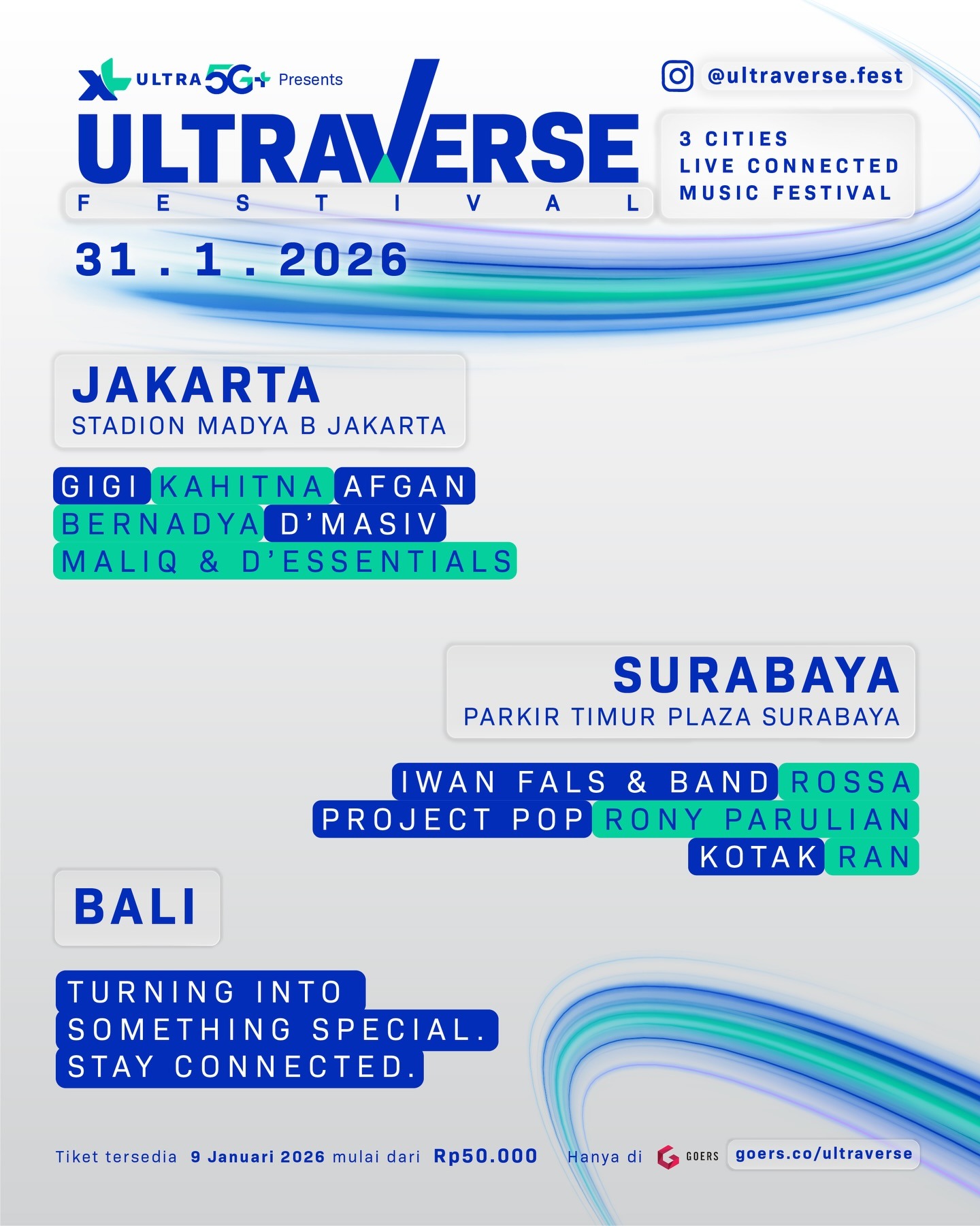 Jakarta, 7 Januari 2026 – Sebuah festival musik bernama Ultraverse Festival dijadwalkan berlangsung pada 31 Januari 2026 mendatang. Acara ini akan diselenggarakan secara serentak di tiga kota, yaitu Jakarta, Surabaya, dan Bali, dengan konsep penghubung langsung antarlocasi melalui teknologi jaringan XL Ultra 5G+.