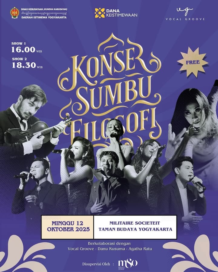 Yogyakarta, 15 September 2025 – Konser Sumbu Filosofi akan digelar pada 12 Oktober 2025 di Militär Societeit, Taman Budaya Yogyakarta, Daerah Istimewa Yogyakarta. Pertunjukan ini dijadwalkan dalam dua sesi, masing-masing pada pukul 16.00 WIB dan 18.30 WIB.