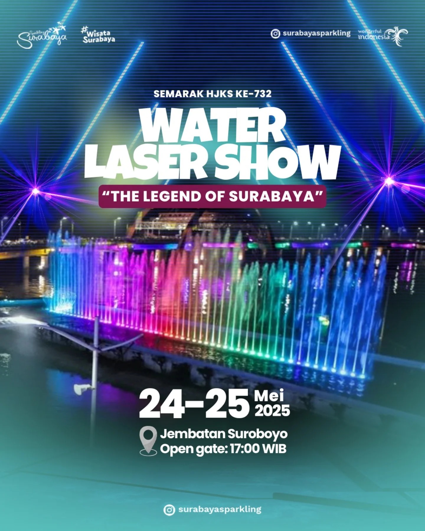 Pertunjukan Water Laser Show akan kembali hadir dengan tema “The Legend of Surabaya”, mengambil latar kisah-kisah yang berkaitan dengan sejarah kota. Acara ini dijadwalkan berlangsung selama dua hari, yaitu pada tanggal 24 dan 25 Mei 2025. Lokasi pertunjukan berada di Jembatan Suroboyo, dengan pintu masuk yang mulai dibuka pada pukul 17.00 WIB.