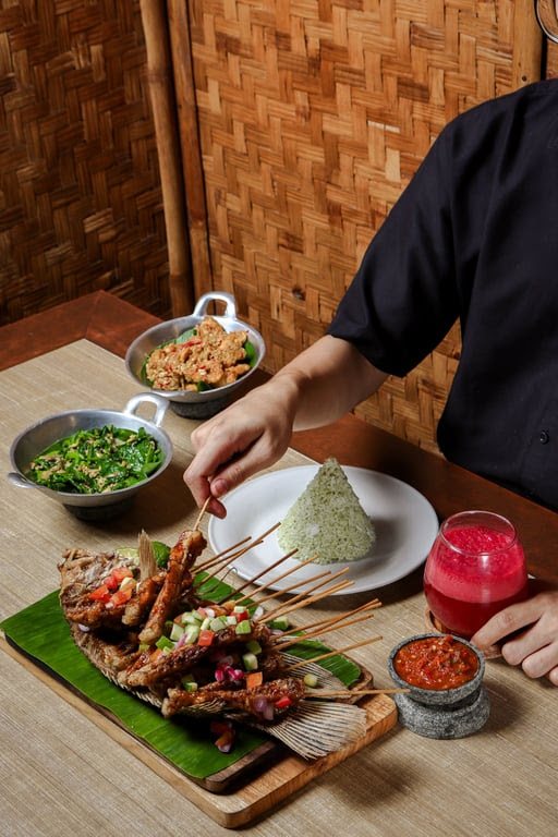 Pendekatan ini terasa jelas di menu-menunya. Salah satu yang mencuri perhatian adalah Ikan Goreng Bumbu Mabu. Sebuah sajian yang mempertemukan dua wilayah yang secara geografis berjauhan. Sambal matah dari Bali dan sambal dabu-dabu dari Sulawesi Utara disatukan dalam satu piring. Hasilnya bukan sekadar fusion, tapi dialog rasa. Segar, pedas, aromatik, dan tetap membiarkan ikan jadi bintang utamanya.
