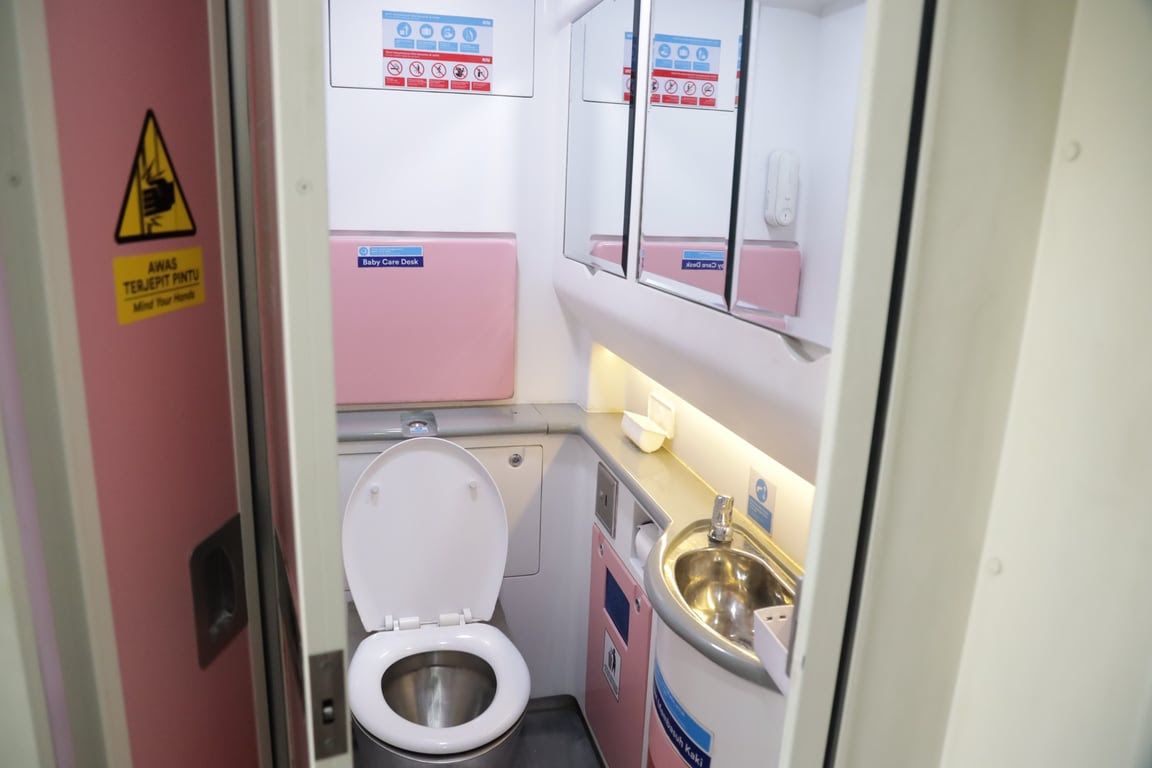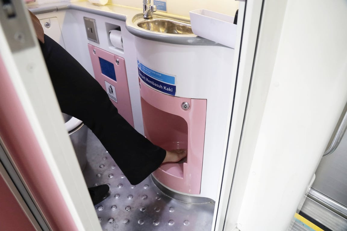 4. Fasilitas tambahan di toilet berupa foot washer dan baby desk chair, yang memberikan kemudahan bagi pelanggan, terutama keluarga yang bepergian dengan anak-anak.
