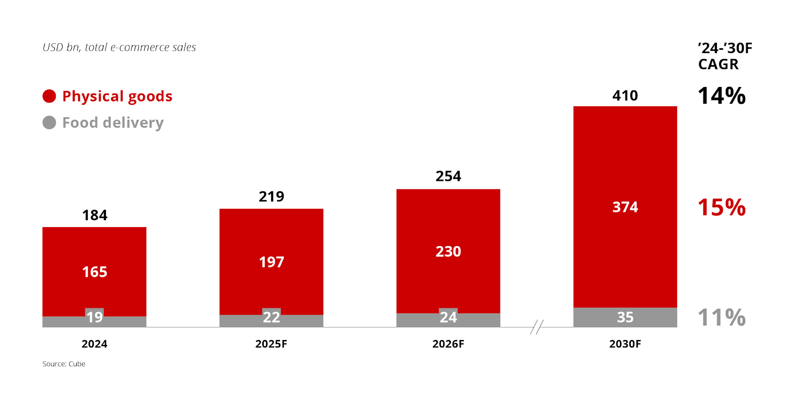 Laporan DBS Nextwave Southeast Asia 2025 merupakan edisi perdana dari seri terbaru yang mengeksplorasi perkembangan pesat ekonomi digital di Asia. Laporan ini disusun melalui kerja sama dengan perusahaan data dan wawasan pasar, Cube. Laporan ini memproyeksikan bahwa penjualan e-commerce di kawasan Asia Tenggara akan meningkat lebih dari dua kali lipat, dari USD184 miliar (SGD240 miliar) pada tahun 2024 menjadi USD410 miliar (SGD535 miliar) pada tahun 2030, dengan tingkat pertumbuhan tahunan gabungan (CAGR) sebesar 14 persen selama periode tersebut (lihat Grafik 1).