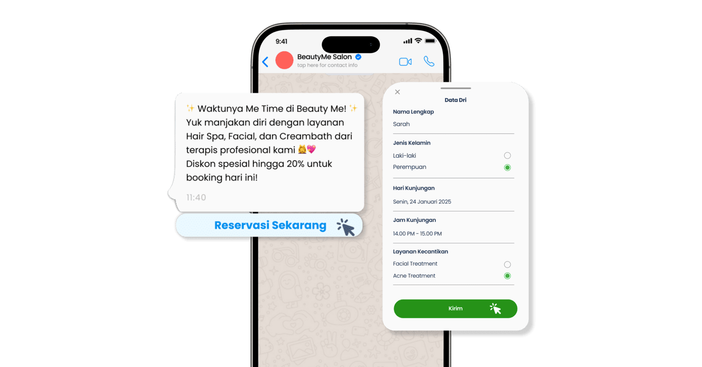 Dengan integrasi ini, proses lead generation tidak lagi manual. Sistem dapat mengirim pesan broadcast, menampilkan formulir langsung di WhatsApp, hingga menyimpan data leads secara otomatis ke CRM.