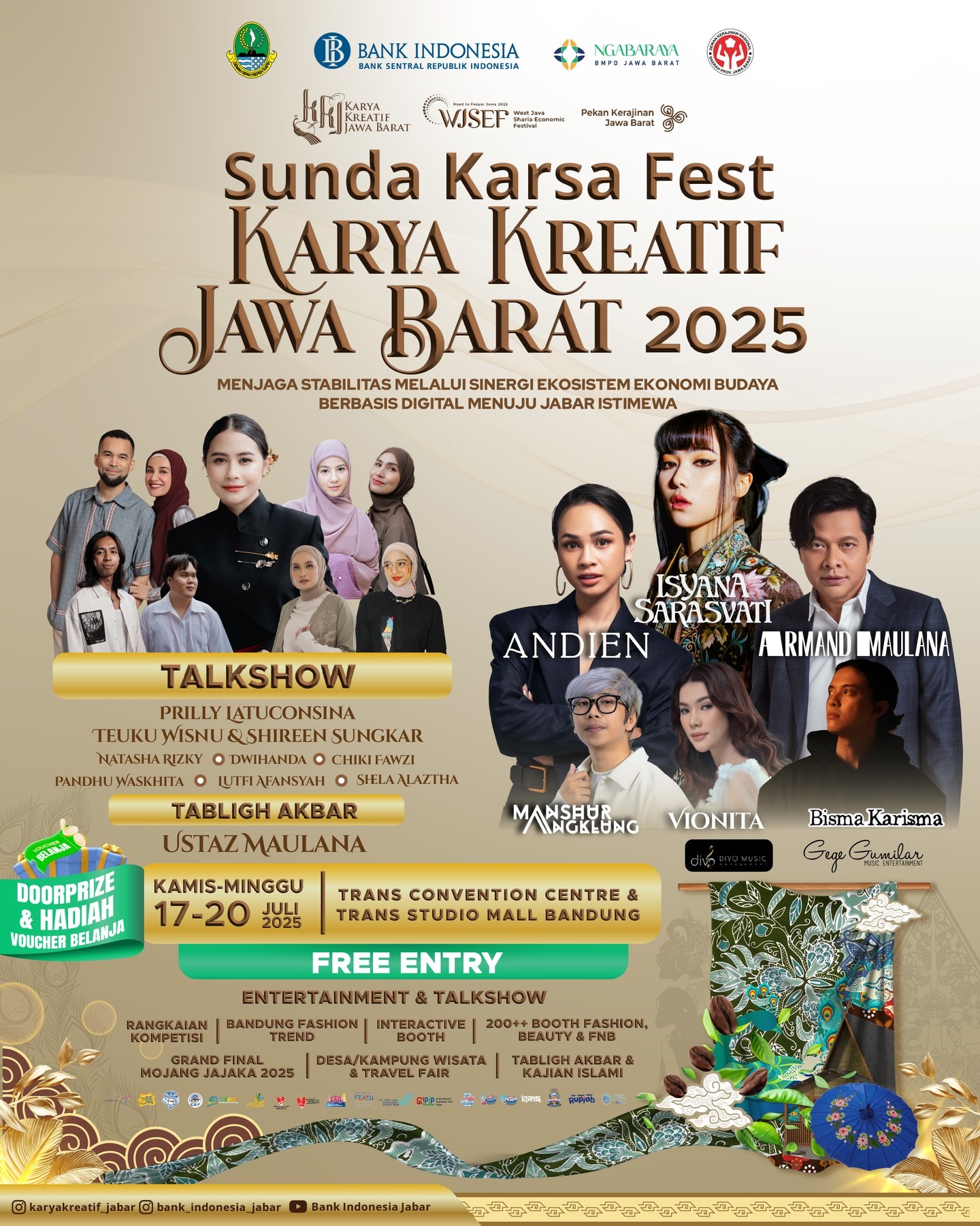 Selain itu, akan ada penampilan khusus dari musisi nasional seperti Isyana Sarasvati, Armand Maulana, dan Andien. Tabligh Akbar juga menjadi bagian dari rangkaian kegiatan, dengan kehadiran Ustaz Maulana sebagai pengisi utama.