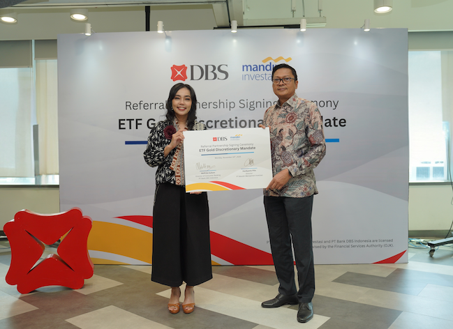 Jakarta, 24 November 2025 – PT Bank DBS Indonesia (“Bank DBS Indonesia”) dan PT Mandiri Manajemen Investasi (“Mandiri Investasi”) resmi menjalin kerja sama referral untuk Pengelolaan Dana Nasabah Individu (PDNI) atau Kontrak Pengelolaan Dana (KPD) Exchange-Traded Fund (ETF) Gold BlackRock (iShares). Kolaborasi ini memperluas jangkauan solusi investasi Bank DBS Indonesia sekaligus menghadirkan akses yang lebih praktis dan modern bagi masyarakat Indonesia untuk berinvestasi emas tanpa harus menyimpan emas fisik secara mandiri.