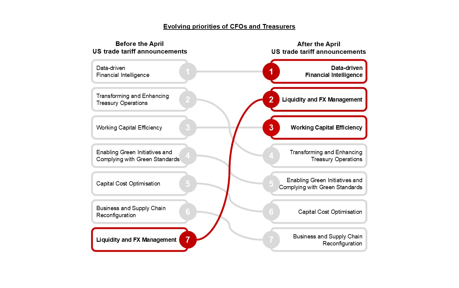 Untuk lebih memahami bagaimana tren makroekonomi mempengaruhi peran dan prioritas para pemimpin keuangan, Bank DBS melakukan survei ini dalam periode berbeda, sebelum dan sesudah pengumuman tarif AS pada April tahun ini. Berdasarkan tujuh prioritas yang diteliti, pemanfaatan financial intelligence berbasis data tetap menjadi prioritas utama perusahaan dalam memperkuat ketahanan keuangan mereka. Hasil survei dari kedua periode konsisten menunjukkan bahwa penggunaan AI untuk analisis dan visualisasi data menjadi penting untuk meningkatkan fungsi perbendaharaan perusahaan.