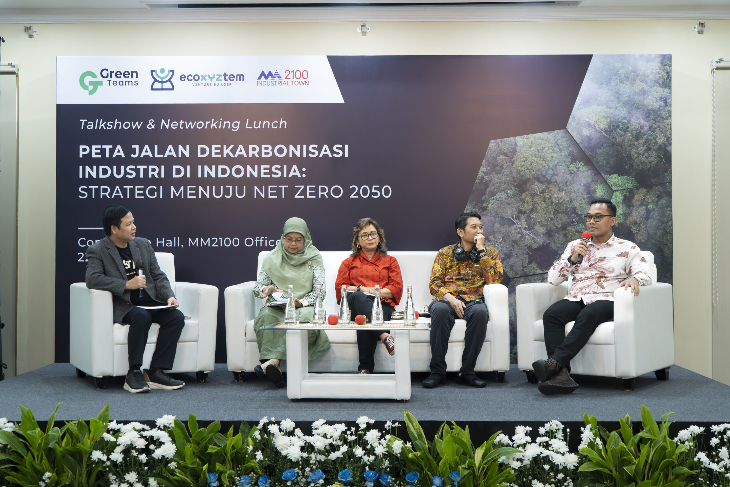Diskusi berformat talkshow ini dibuka dengan sambutan dari Dr. Winardi, M.Si., Direktur Perwilayahan Industri, Kementerian Perindustrian, H. Darwoto, S.E., Deputy Director Kawasan Industri MM2100, serta Ir. Noor Rachmaniah, Kepala Kelompok Kerja Pengendalian Pencemaran dan Mutu (Pokja PPMU), Kementerian Lingkungan Hidup, mengantar diskusi yang membahas pentingnya strategi dalam merencanakan peta jalan dekarbonisasi sebagai syarat utama dalam rantai pasok global.