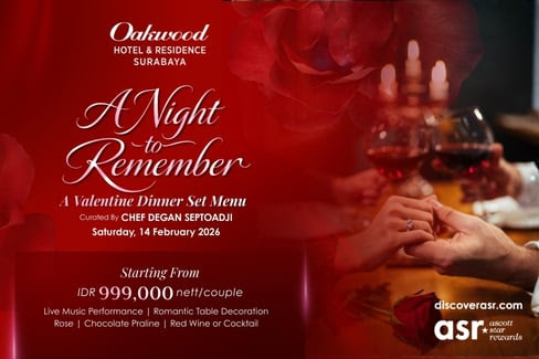 Bagi pasangan yang mencari pengalaman makan malam romantis yang tak terlupakan, tanggal 14 Februari nanti Oakwood menghadirkan kolaborasi luar biasa. Bertajuk “A Night to Remember”, makan malam set menu ini dikurasi langsung oleh Chef Degan Saptoadji.