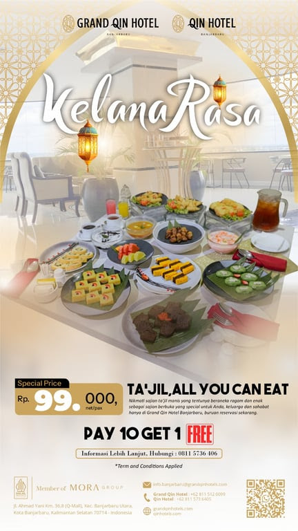 Marketing Communication Grand Qin Hotel Banjarbaru, Yudha, menambahkan bahwa selama periode Ramadan, hotel juga menghadirkan berbagai promo spesial.“Kami memberikan diskon 10 persen pada tiga hari pertama Ramadan (1–3 Ramadan) dan tiga hari terakhir Ramadan (28–30 Ramadan). Selain itu, tersedia promo beli 10 gratis 1, di mana tamu ke-11 tidak dikenakan biaya,” ungkapnya.