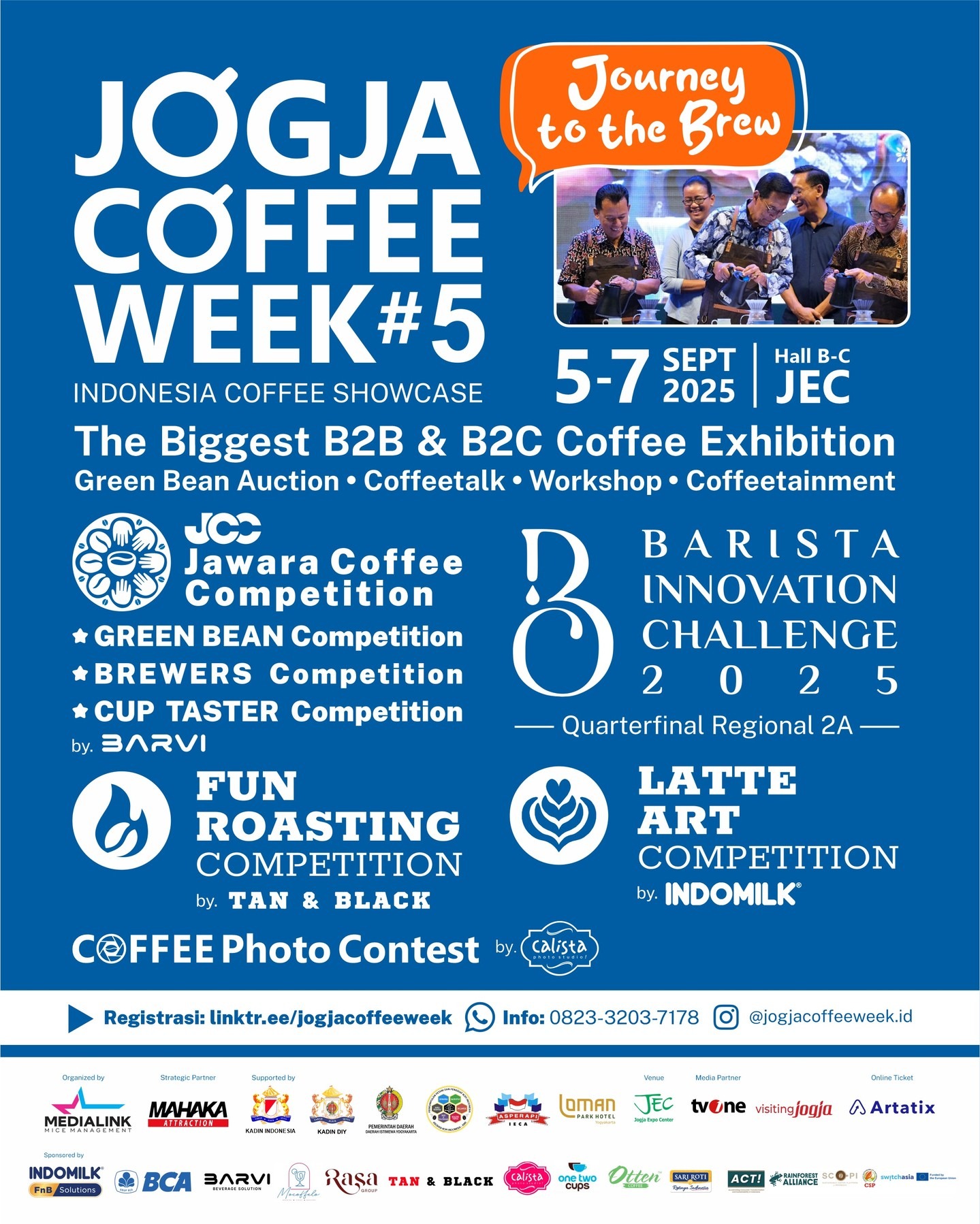 Yogyakarta, 25 Agustus 2025 – Jogja Coffee Week (JCW) #5 dengan tema “Journey to the Brew” akan berlangsung pada 5–7 September 2025 di Hall B dan C, Jogja Expo Center (JEC) Yogyakarta. Acara ini menjadi kelanjutan dari JCW #4 yang telah digelar tahun 2024 dan mencatat peningkatan signifikan pada jumlah peserta maupun pengunjung.